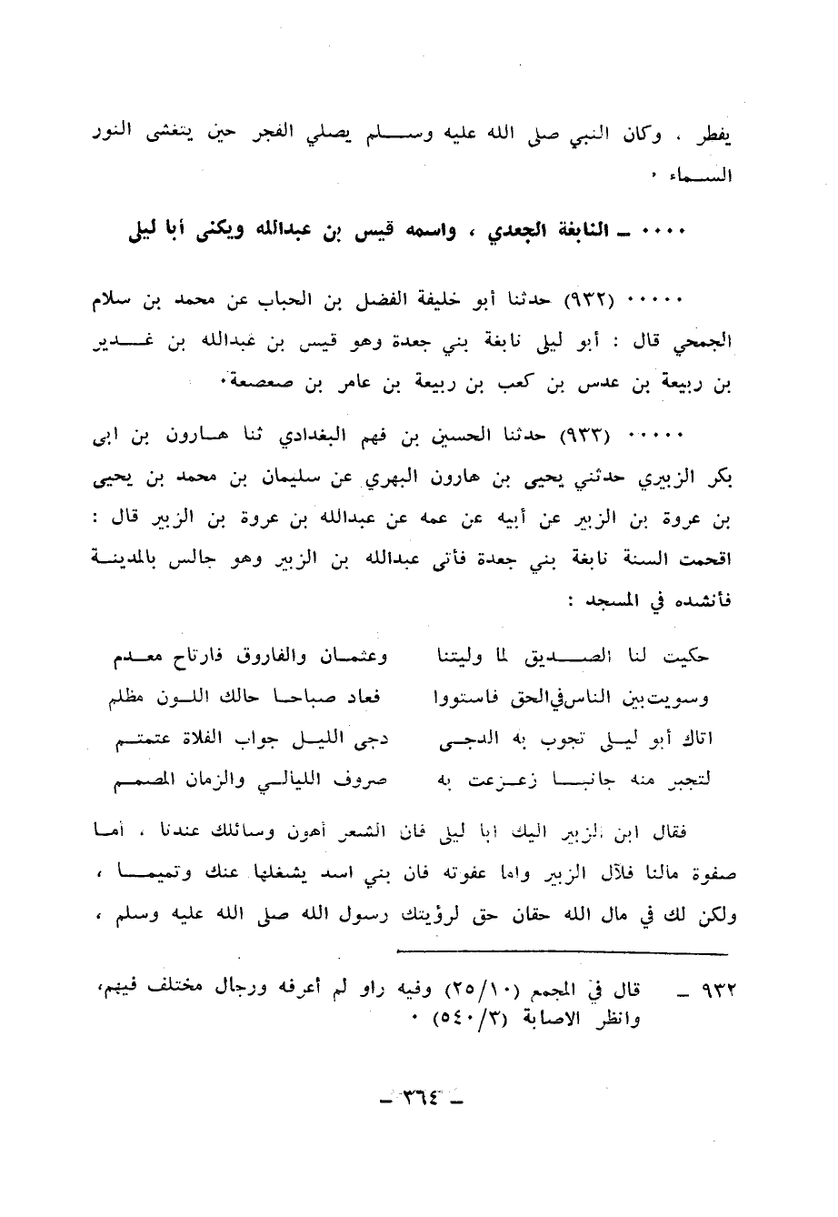 932 - حَدَّثَنَا أَبُو خَلِيفَةَ الْفَضْلُ بْنُ الْحُبَابِ، عَنْ مُحَمَّدِ بْنِ سَلَّامٍ الْجُمَحِيِّ، قَالَ: «أَبُو لَيْلَى نَابِغَةُ بَنِي جَعْدَةَ وَهُوَ قَيْسُ بْنُ عَبْدِ اللهِ بْنِ غَدِيرِ بْنِ رَبِيعَةَ بْنِ عُدُسِ بْنِ كَعْبِ بْنِ رَبِيعَةَ بْنِ عَامِرِ بْنِ صَعْصَعَةَ»