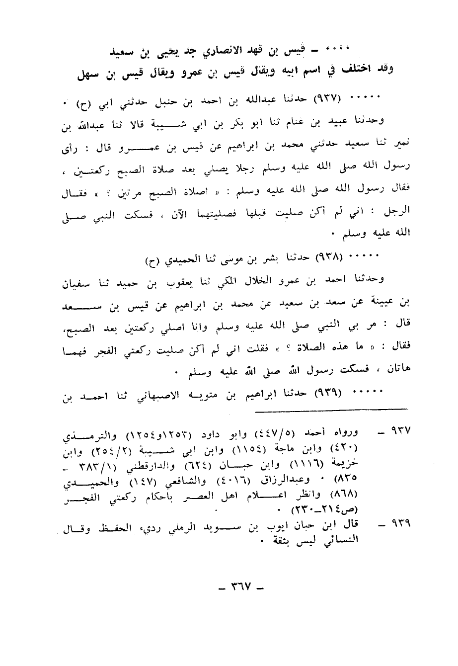 937 - حَدَّثَنَا عَبْدُ اللهِ بْنُ أَحْمَدَ بْنِ حَنْبَلٍ، حَدَّثَنِي أَبِي ح، وَحَدَّثَنَا عُبَيْدُ بْنُ غَنَّامٍ، ثَنَا أَبُو بَكْرِ بْنُ أَبِي شَيْبَةَ، قَالَا: ثَنَا عَبْدُ اللهِ بْنُ نُمَيْرٍ، ثَنَا سَعِيدُ، حَدَّثَنِي مُحَمَّدُ بْنُ إِبْرَاهِيمَ، عَنْ قَيْسِ بْنِ عَمْرٍو، قَالَ: رَأَى رَسُولُ اللهِ صَلَّى اللهُ عَلَيْهِ وَسَلَّمَ رَجُلًا يُصَلِّي بَعْدَ صَلَاةِ الصُّبْحِ رَكْعَتَيْنِ، فَقَالَ رَسُولُ اللهِ صَلَّى اللهُ عَلَيْهِ وَسَلَّمَ: «§أَصَلَاةُ الصُّبْحِ مَرَّتَيْنِ؟» فَقَالَ الرَّجُلُ: إِنِّي لَمْ أَكُنْ صَلَّيْتُ قَبْلَهَا فَصَلَّيْتُهُمَا الآنَ، فَسَكَتَ النَّبِيُّ صَلَّى اللهُ عَلَيْهِ وَسَلَّمَ