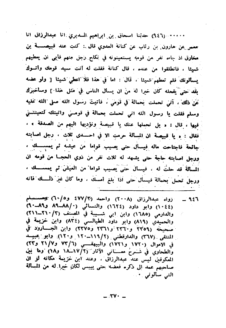 946 - حَدَّثَنَا إِسْحَاقُ بْنُ إِبْرَاهِيمَ الدَّبَرِيُّ، أَنَا عَبْدُ الرَّزَّاقِ، أَنَا مَعْمَرٌ، عَنْ هَارُونَ بْنِ رِئَابٍ، عَنْ كِنَانَةَ الْعَدَوِيِّ، قَالَ: كُنْتُ عِنْدَ قَبِيصَةَ بْنِ مُخَارِقٍ إِذْ جَاءَهُ نَفَرٌ مِنْ قَوْمِهِ يَسْتَعِينُونَهُ فِي نِكَاحِ رَجُلٍ مِنْهُمْ فَأَبَى أَنْ يُعْطِيَهَمْ شَيْئًا فَانْطَلَقُوا مِنْ عِنْدِهِ قَالَ كِنَانَةُ: فَقُلْتُ لَهُ: أَنْتَ سَيِّدُ قَوْمِكَ، وَأَتَوكَ يَسْأَلُونَكَ فَلَمْ تُعْطِهِمْ شَيْئًا، قَالَ: أَمَّا فِي هَذَا فَلَا أُعْطِي شَيْئًا وَلَوْ عَضَّهُ بِقَدٍّ حَتَّى يَقْحَلَهُ كَانَ خَيْرًا لَهُ مِنْ أَنْ يَسْأَلَ النَّاسَ فِي مِثْلِ هَذَا، وَسَأُخْبِرُكَ عَنْ ذَلِكَ إِنِّي تَحَمَّلْتُ بِحَمَالَةٍ فِي قَوْمِي فَأَتَيْتُ رَسُولَ اللهِ صَلَّى اللهُ عَلَيْهِ وَسَلَّمَ فَقُلْتُ: يَا رَسُولَ اللهِ، إِنِّي تَحَمَّلْتُ بِحَمَالَةٍ فِي قَوْمِي وَأَتَيْتُكَ لِتُعِينَنِي فِيهَا، قَالَ: «بَلْ نَحْمِلُهَا عَنْكَ يَا قَبِيصَةُ وَنُؤَدِّيهَا إِلَيْهِمْ مِنَ الصَّدَقَةِ» فَقَالَ: «يَا قَبِيصَةُ، §إِنَّ الْمَسْأَلَةَ حُرِّمَتْ إِلَّا فِي إِحْدَى ثَلَاثٍ، رَجُلٌ أَصَابَتْهُ جَائِحَةٌ فَاجْتَاحَتْ مَالَهُ فَيَسْأَلُ حَتَّى يُصِيبَ قِوَامًا مِنْ عَيْشِهِ ثُمَّ يُمْسِكُ، وَرَجُلٌ أَصَابَتْهُ حَاجَةٌ حَتَّى يَشْهَدَ لَهُ ثَلَاثُ نَفَرٍ مِنْ ذَوِي الْحِجَا مِنْ قَوْمِهِ أَنَّ الْمَسْأَلَةَ قَدْ حَلَّتْ لَهُ فَيَسْأَلُ حَتَّى يُصِيبَ قِوَامًا مِنَ الْعَيْشِ ثُمَّ يُمْسِكُ، وَرَجُلٌ تَحَمَّلَ بِحَمَالَةٍ فَيَسْأَلُ حَتَّى إِذَا بَلَغَ أَمْسَكَ، وَمَا كَانَ غَيْرُ ذَلِكَ فَإِنَّهُ سُحْتٌ يَأْكُلُهُ سُحْتًا»