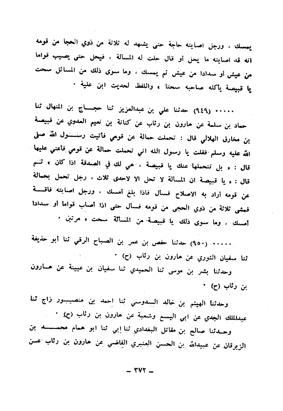950 - حَدَّثَنَا حَفْصُ بْنُ عُمَرَ بْنِ الصَّبَّاحِ الرَّقِّيُّ، ثَنَا أَبُو حُذَيْفَةَ، ثَنَا سُفْيَانُ الثَّوْرِيُّ، عَنْ هَارُونَ بْنِ رِئَابٍ، ح وَحَدَّثَنَا بِشْرُ بْنُ مُوسَى، ثَنَا الْحُمَيْدِيُّ، ثَنَا سُفْيَانُ بْنُ عُيَيْنَةَ، عَنْ هَارُونَ بْنِ رِئَابٍ، ح وَحَدَّثَنَا الْهَيْثَمُ بْنُ خَالِدٍ السَّدُوسِيُّ، ثَنَا أَحْمَدُ بْنُ مَنْصُورٍ زَاجٌّ ثَنَا عَبْدُ الْمَلِكِ الْجُدِّيُّ، عَنْ أَبِي الْيَسَعَ، وَشُعْبَةُ، عَنْ هَارُونَ بْنِ رِئَابٍ، ح وَحَدَّثَنَا صَالِحُ بْنُ مُقَاتِلٍ الْبَغْدَادِيُّ، ثَنَا أَبِي، ثَنَا أَبُو هَمَّامٍ مُحَمَّدُ بْنُ الزِّبْرِقَانِ، عَنْ عُبَيْدِ اللهِ بْنِ الْحَسَنِ الْعَنْبَرِيِّ الْقَاضِي، عَنْ هَارُونَ بْنِ رِئَابٍ، عَنْ كِنَانَةَ بْنِ نُعَيْمٍ، عَنْ قَبِيصَةَ بْنِ الْمُخَارِقٍ، قَالَ: تَحَمَّلْتُ بِحَمَالَةٍ فَذَكَرَ عَنِ النَّبِيِّ صَلَّى اللهُ عَلَيْهِ وَسَلَّمَ نَحْوَهُ -[373]-.