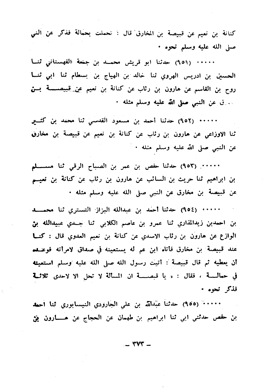 953- حَدَّثَنَا حَفْصُ بْنُ عُمَرَ بْنِ الصَّبَّاحِ الرَّقِّيُّ ، حَدَّثَنَا مُسْلِمُ بْنُ إِبْرَاهِيمَ ، حَدَّثَنَا حُرَيْثُ بْنُ السَّائِبِ ، عَنْ هَارُونَ بْنِ رِئَابٍ ، عَنْ كِنَانَةَ بْنِ نُعَيْمٍ ، عَنْ قَبِيصَةَ بْنِ مُخَارِقٍ ، عَنِ النَّبِيِّ صَلَّى اللَّهُ عَلَيْهِ وَسَلَّمَ مِثْلَهُ.