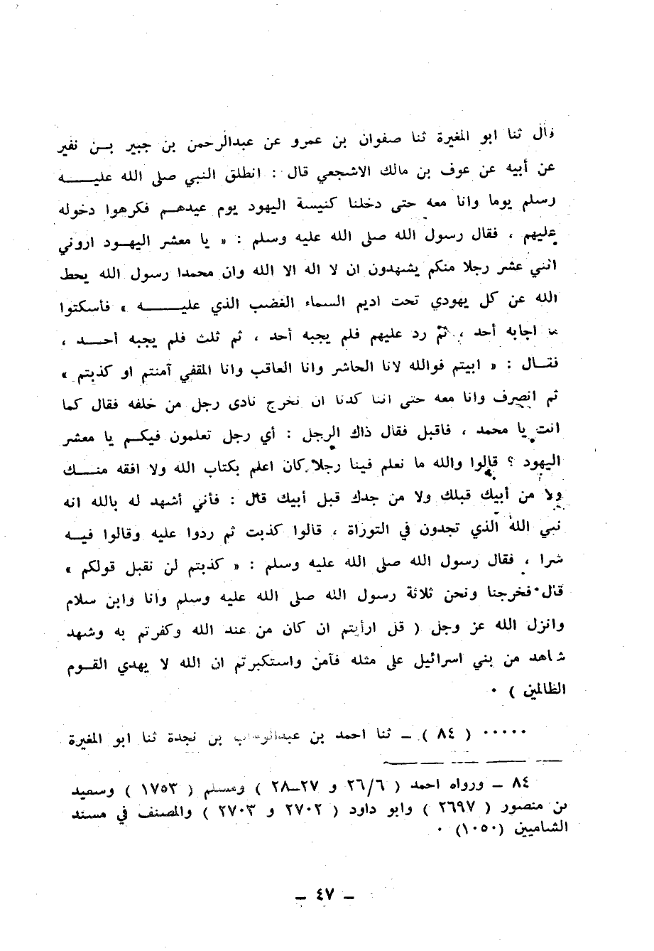 84 - ثَنَا أَحْمَدُ بْنُ عَبْدِ الْوَهَّابِ بْنِ نَجْدَةَ، ثنا أَبُو الْمُغِيرَةِ، ثنا صَفْوَانُ، ح وَحَدَّثَنَا أَحْمَدُ بْنُ عَبْدِ الْوَهَّابِ بْنِ نَجْدَةَ الْحَوْطِيُّ، ثنا أَبِي، ثنا إِسْمَاعِيلُ بْنُ عَيَّاشٍ، عَنْ صَفْوَانَ بْنِ عَمْرٍو، عَنْ عَبْدِ الرَّحْمَنِ بْنِ جُبَيْرِ بْنِ نُفَيْرٍ، عَنْ أَبِيهِ، عَنْ عَوْفِ بْنِ مَالِكٍ، أَنَّ رَسُولَ اللهِ صَلَّى اللهُ عَلَيْهِ وَسَلَّمَ لَمْ يُخَمِّسِ السَّلَبَ وَأَنَّ مَدَدِيًّا كَانَ رَفِيقًا لَهُ فِي غَزْوَةِ مُؤْتَةَ فِي طَرَفِ الشَّامِ، فَلَقُوا الْعَدُوَّ، فَجَعَلَ الرُّومِيُّ مِنْهُمْ يَشْتَدُّ عَلَى الْمُسْلِمِينَ وَهُوَ عَلَى فَرَسٍ أَشْقَرَ، وَسَرْجٍ مُذْهَبٍ، وَمِنْطَقَةٍ مُلَطَّخَةٍ بِذَهَبٍ، وَسَيْفٍ مُحَلًّى مِنْ ذَهَبٍ، فَيُغْزِي بِهِمْ، فَيَلْطُفُ لَهُ ذَلِكَ الْمَدَدِيُّ حَتَّى مَرَّ بِهِ فَعَرْقَبَ فَرَسَهُ، فَوَقَعَ ثُمَّ عَلَاهُ بِالسَّيْفِ فَقَتَلَهُ، فَلَمَّا هَزَمَ اللهُ الرُّومَ قَامَتِ الْبَيِّنَةُ لِلْمَدَدِيِّ إِنَّهُ قَتَلَهُ، فَأَعْطَاهُ خَالِدٌ سَيْفَهُ وَخُمْسَ مَالِهِ، قَالَ عَوْفٌ: فَكَلَّمَتُ خَالِدَ بْنَ الْوَلِيدِ فَقُلْتُ: أَمَا تَعْلَمُ أَنَّ رَسُولَ اللهِ صَلَّى اللهُ عَلَيْهِ وَسَلَّمَ قَضَى بِالسَّلَبِ لِلْقَاتِلِ؟ قَالَ: بَلَى وَلَكِنِّي اسْتَكْثَرْتُهُ، قَالَ عَوْفٌ: وَكَانَ بَيْنِي وَبَيْنَهُ كَلَامٌ فَقُلْتُ: وَاللهِ لَأُخْبِرَنَّ رَسُولَ اللهِ صَلَّى اللهُ عَلَيْهِ وَسَلَّمَ خَبَرَكَ، قَالَ عَوْفٌ: فَلَمَّا اجْتَمَعْنَا عِنْدَ النَّبِيِّ صَلَّى اللهُ عَلَيْهِ وَسَلَّمَ ذَكَرَ عَوْفٌ مَا كَانَ مِنْهُ فَقَالَ رَسُولُ اللهِ صَلَّى اللهُ عَلَيْهِ وَسَلَّمَ: «مَا مَنَعَكَ أَنْ تَدْفَعَ إِلَيْهِ؟» فَقَالَ خَالِدٌ: اسْتَكْثَرْتُهُ، قَالَ: «ادْفَعْهُ إِلَيْهِ» قَالَ عَوْفٌ: فَقُلْتُ: كَيْفَ رَأَيْتَ يَا خَالِدُ، أَلَمْ أُنْجِزْ لَكَ مَا وَعَدْتُكَ؟ فَغَضِبَ رَسُولُ اللهِ صَلَّى اللهُ عَلَيْهِ وَسَلَّمَ وَقَالَ لِخَالِدٍ: «لَا تُعْطِهِ» وَقَالَ: «§مَا أَنْتُمْ بِتَارِكِي لِي أُمَرَائِي»