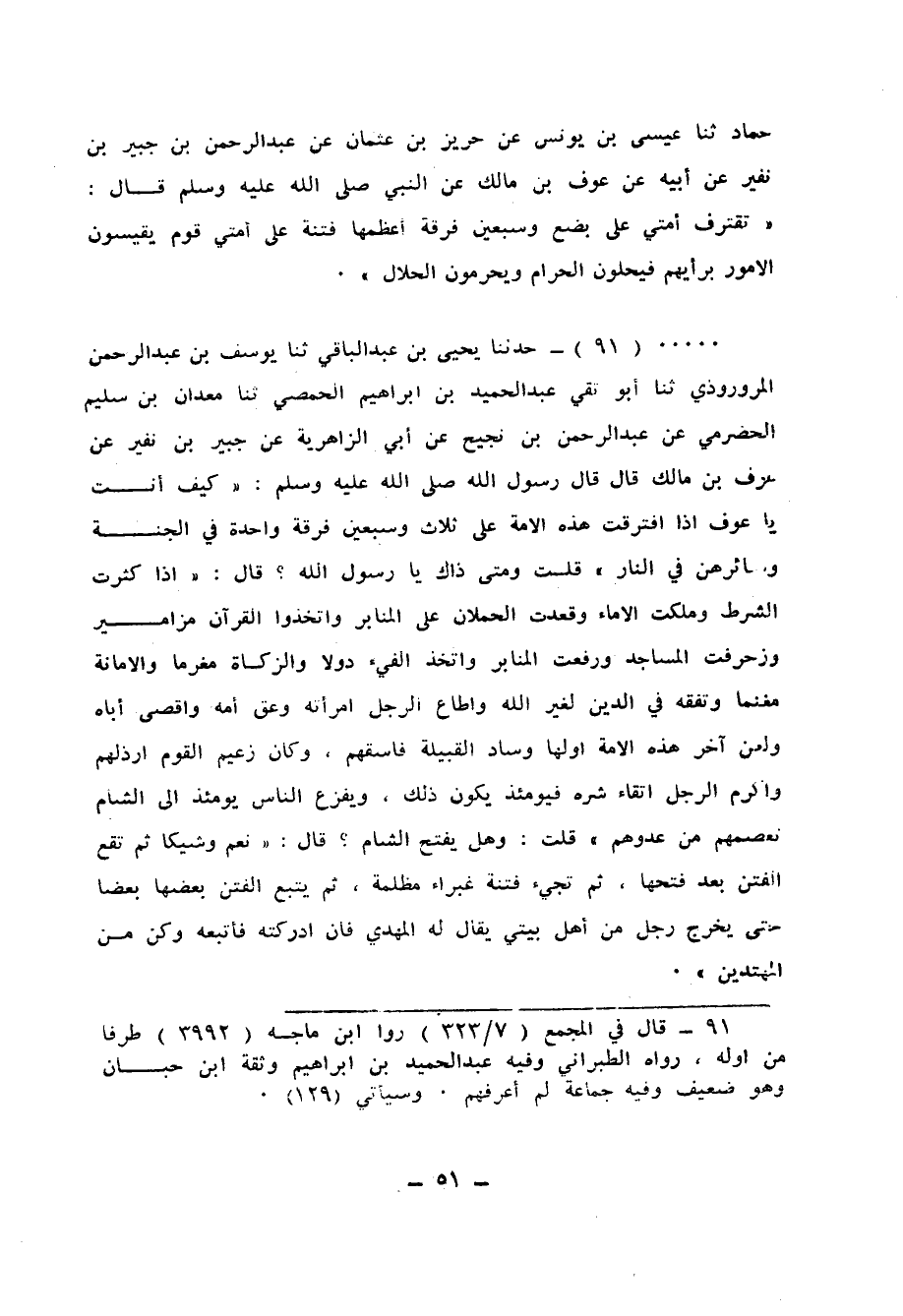 91 - حَدَّثَنَا يَحْيَى بْنُ عَبْدِ الْبَاقِي، ثنا يُوسُفُ بْنُ عَبْدِ الرَّحْمَنِ الْمَرْوَرُوذِيُّ، ثنا أَبُو تَقِيِّ عَبْدُ الْحَمِيدِ بْنُ إِبْرَاهِيمَ الْحِمْصِيُّ، ثنا مَعْدَانُ بْنُ سُلَيْمٍ الْحَضْرَمِيُّ، عَنْ عَبْدِ الرَّحْمَنِ بْنِ نَجِيحٍ، عَنْ أَبِي الزَّاهِرِيَّةِ، عَنْ جُبَيْرِ بْنِ نُفَيْرٍ، عَنْ عَوْفِ بْنِ مَالِكٍ، قَالَ: قَالَ رَسُولُ اللهِ صَلَّى اللهُ عَلَيْهِ وَسَلَّمَ: «كَيْفَ أَنْتَ يَا عَوْفٌ §إِذَا افْتَرَقَتْ هَذِهِ الْأُمَّةُ عَلَى ثَلَاثٍ وَسَبْعِينَ فِرْقَةً، وَاحِدَةٌ فِي الْجَنَّةِ وَسَائِرُهُنَّ فِي النَّارِ؟» قُلْتُ: وَمَتَى ذَاكَ يَا رَسُولَ اللهِ؟ قَالَ: «إِذَا كَثُرَتِ الشُّرَطُ، وَمَلَكَتِ الْإِمَاءُ، وَقَعَدَتِ الْحُمْلَانُ عَلَى الْمَنَابِرِ، وَاتَّخَذُوا الْقُرْآنَ مَزَامِيرَ، وَزُخْرِفَتِ الْمَسَاجِدُ، وَرُفِعَتِ الْمَنَابِرُ، وَاتُّخِذَ الْفَيْءُ دُوَلًا وَالزَّكَاةُ مَغْرَمًا، وَالْأَمَانَةُ مَغْنَمًا، وَتُفُقِّهَ فِي الدِّينِ لِغَيْرِ اللهِ، وَأَطَاعَ الرَّجُلُ امْرَأَتَهُ، وَعَقَّ أُمَّهُ، وَأَقْصَى أَبَاهُ، وَلَعَنَ آخِرُ هَذِهِ الْأُمَّةِ أَوَّلَهَا، وَسَادَ الْقَبِيلَةَ فَاسِقُهُمْ، وَكَانَ زَعِيمُ الْقَوْمِ أَرْذَلَهُمْ، وَأُكْرِمَ الرَّجُلُ اتِّقَاءَ شَرِّهِ، فَيَوْمَئِذٍ يَكُونُ ذَلِكَ، وَيَفْزَعُ النَّاسُ يَوْمَئِذٍ إِلَى الشَّامِ تَعْصِمُهُمْ مِنْ عَدُوِّهِمْ» قُلْتُ: وَهَلْ يُفْتَحُ الشَّامُ؟ قَالَ: «نَعَمْ وَشِيكًا، ثُمَّ تَقَعُ الْفِتَنُ بَعْدَ فَتْحِهَا، ثُمَّ تَجِيءُ فِتْنَةٌ غَبْرَاءُ مُظْلِمَةٌ، ثُمَّ يَتْبَعُ الْفِتَنُ بَعْضُهَا بَعْضًا حَتَّى يَخْرُجَ رَجُلٌ مِنْ أَهْلِ بَيْتِي يُقَالُ لَهُ الْمَهْدِيُّ، فَإِنْ أَدْرَكْتَهُ فَاتْبَعْهُ وَكُنْ مِنَ الْمُهْتَدِينَ»