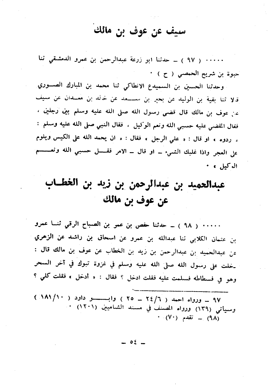 97 - حَدَّثَنَا أَبُو زُرْعَةَ عَبْدُ الرَّحْمَنِ بْنُ عَمْرٍو الدِّمَشْقِيُّ، ثنا حَيْوَةُ بْنُ شُرَيْحٍ الْحِمْصِيُّ، ح وَحَدَّثَنَا الْحُسَيْنُ بْنُ السَّمَيْدَعِ الْأَنْطَاكِيُّ، ثنا مُحَمَّدُ بْنُ الْمُبَارَكِ الصُّورِيُّ، قَالَا: ثنا بَقِيَّةُ بْنُ الْوَلِيدِ، عَنْ بَحِيرِ بْنِ سَعْدٍ، عَنْ خَالِدِ بْنِ مَعْدَانَ، عَنْ سَيْفٍ، عَنْ عَوْفِ بْنِ مَالِكٍ قَالَ: قَضَى رَسُولُ اللهِ صَلَّى اللهُ عَلَيْهِ وَسَلَّمَ بَيْنَ رَجُلَيْنِ، فَقَالَ الْمَقْضِيُّ عَلَيْهِ: حَسْبِيَ اللهُ وَنِعْمَ الْوَكِيلُ، فَقَالَ النَّبِيُّ صَلَّى اللهُ عَلَيْهِ وَسَلَّمَ: «رُدُّوهُ، أَوْ قَالَ عَلِيَّ الرَّجُلَ؟» فَقَالَ: «إِنَّ §اللهَ يَحْمَدُ عَلَى الْكَيْسِ، ويَلُومُ عَلَى الْعَجْزِ، وَإِذَا غَلَبَكَ الشَّيْءُ» أَوْ قَالَ الْأَمْرُ فَقُلْ: «حَسْبِيَ اللهُ وَنِعْمَ الْوَكِيلُ»