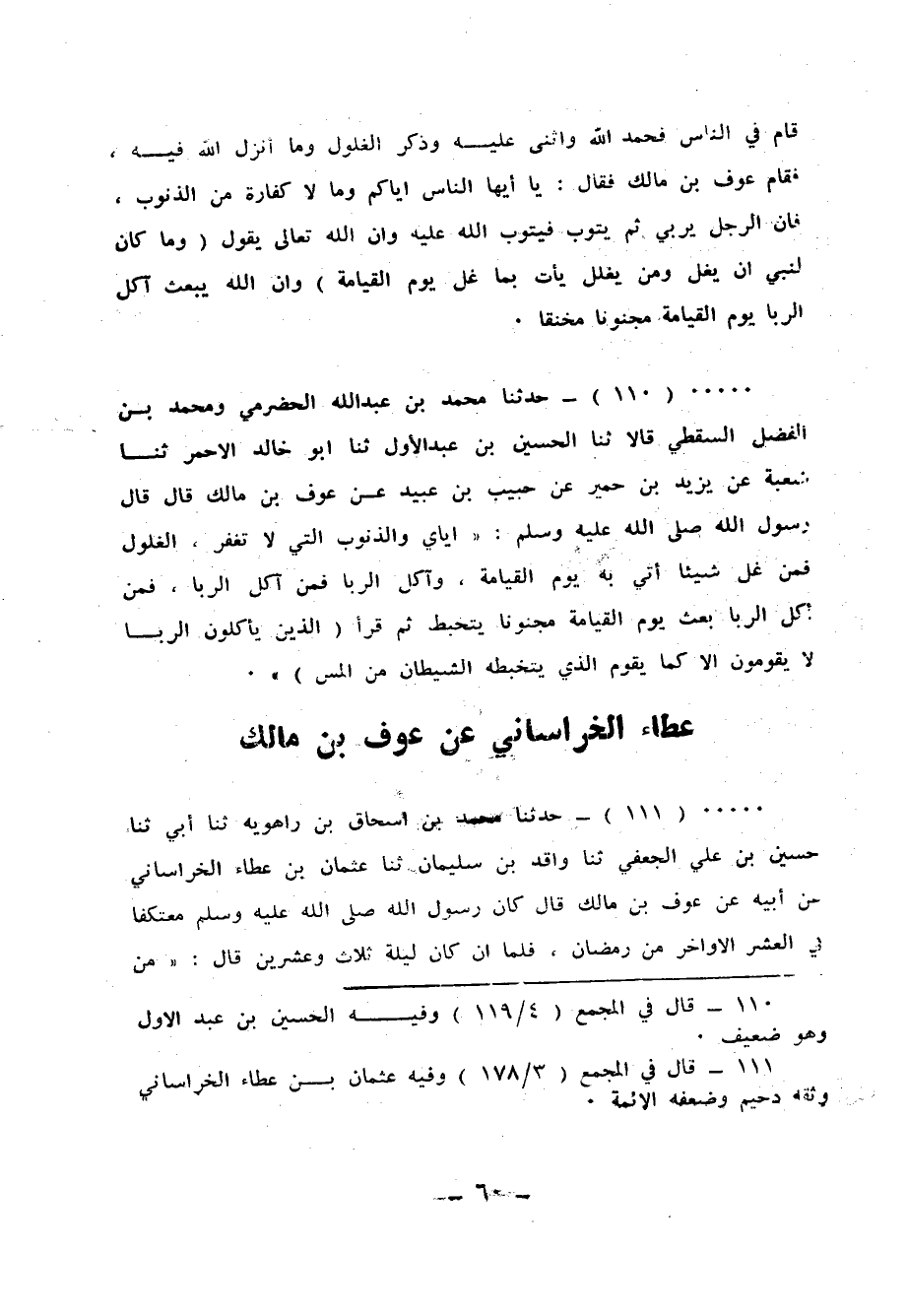 110 - حَدَّثَنَا مُحَمَّدُ بْنُ عَبْدِ اللهِ الْحَضْرَمِيُّ، وَمُحَمَّدُ بْنُ الْفَضْلِ السَّقَطِيُّ قَالَا: ثنا الْحُسَيْنُ بْنُ عَبْدِ الْأَوَّلِ، ثنا أَبُو خَالِدٍ الْأَحْمَرُ، ثنا شُعْبَةُ، عَنْ يَزِيدَ بْنِ حِمْيَرٍ، عَنْ حَبِيبِ بْنِ عُبَيْدٍ، عَنْ عَوْفِ بْنِ مَالِكٍ قَالَ: قَالَ رَسُولُ اللهِ صَلَّى اللهُ عَلَيْهِ وَسَلَّمَ: " §إِيَّايَ وَالذُّنُوبَ الَّتِي لَا تُغْفَرُ: الْغُلُولُ فَمَنْ غَلَّ شَيْئًا أَتَى بِهِ يَوْمَ الْقِيَامَةِ، وَآكِلُ الرِّبَا فَمَنْ أَكَلَ الرِّبَا بُعِثَ يَوْمَ الْقِيَامَةِ مَجْنُونًا يَتَخَبَّطُ " ثُمَّ قَرَأَ: {الَّذِينَ يَأْكُلُونَ الرِّبَا لَا يَقُومُونَ إِلَّا كَمَا يَقُومُ الَّذِي يَتَخَبَّطُهُ الشَّيْطَانُ مِنَ الْمَسِّ} [البقرة: 275]