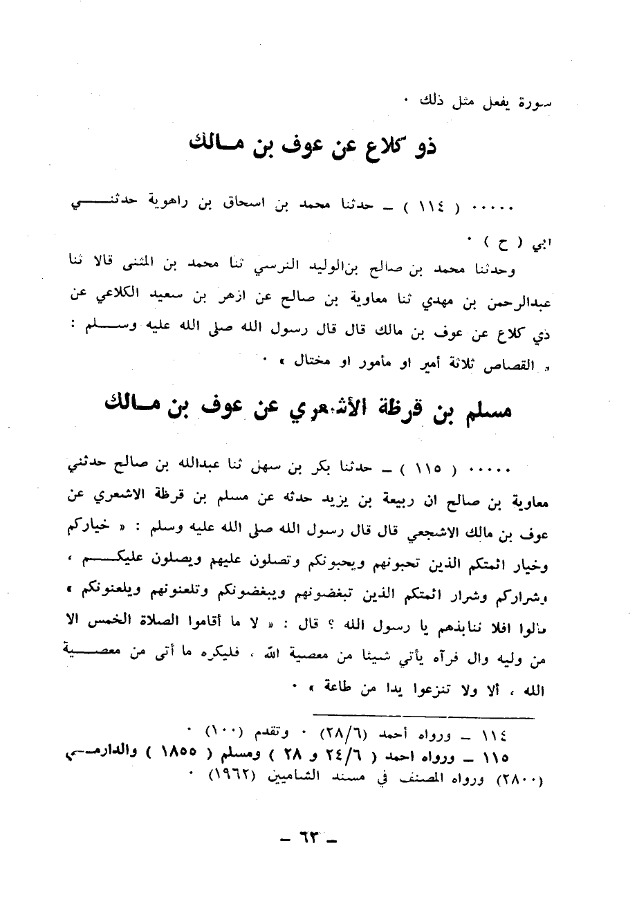 115 - حَدَّثَنَا بَكْرُ بْنُ سَهْلٍ، ثنا عَبْدُ اللهِ بْنُ صَالِحٍ، حَدَّثَنِي مُعَاوِيَةُ بْنُ صَالِحٍ، أَنَّ رَبِيعَةَ بْنَ يَزِيدَ، حَدَّثَهُ، عَنْ مُسْلِمِ بْنِ قَرَظَةَ الْأَشْعَرِيِّ، عَنْ عَوْفِ بْنِ مَالِكٍ الْأَشْجَعِيِّ قَالَ: قَالَ رَسُولُ اللهِ صَلَّى اللهُ عَلَيْهِ وَسَلَّمَ: «§خِيَارُكُمْ وَخِيَارُ أَئِمَّتِكُمُ الَّذِينَ تُحِبُّونَهُمْ وَيُحِبُّونَكُمْ وَتُصَلُّونَ عَلَيْهِمْ وَيُصَلُّونَ عَلَيْكُمْ، وَشِرَارُكُمْ وَشِرَارُ أَئِمَّتِكُمُ الَّذِينَ تُبْغِضُونَهُمْ وَيُبْغِضُونَكُمْ وَتَلْعَنُونَهُمْ وَيَلْعَنُونَكُمْ» قَالُوا: أَفَلَا نُنَابِذُهُمْ يَا رَسُولَ اللهِ؟ قَالَ: «لَا مَا أَقَامُوا الصَّلَاةَ الْخَمْسَ، إِلَّا مَنْ وَلِيَهُ وَالٍ فَرَآهُ يَأْتِي شَيْئًا مِنْ مَعْصِيَةِ اللهِ، فَلْيَكْرَهْ مَا أَتَى مِنْ مَعْصِيَةِ اللهِ، أَلَا وَلَا تَنْزِعُوا يَدًا مِنْ طَاعَةٍ»