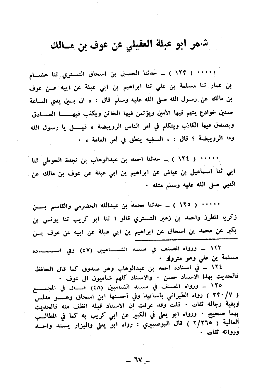 123 - حَدَّثَنَا الْحُسَيْنُ بْنُ إِسْحَاقَ التُّسْتَرِيُّ، ثنا هِشَامُ بْنُ عَمَّارٍ، ثنا مَسْلَمَةُ بْنُ عُلَيٍّ، ثنا إِبْرَاهِيمُ بْنُ أَبِي عَبْلَةَ، عَنْ أَبِيهِ، عَنْ عَوْفِ بْنِ مَالِكٍ، عَنْ رَسُولِ اللهِ صَلَّى اللهُ عَلَيْهِ وَسَلَّمَ قَالَ: «إِنَّ §بَيْنَ يَدَيِ السَّاعَةِ سِنِينَ خَوَادِعَ، يُتَّهَمُ فِيهَا الْأَمِينُ، وَيُؤْتَمَنُ فِيهَا الْخَائِنُ، وَيُكَذَّبُ فِيهَا الصَّادِقُ، وَيُصَدِّقُ فِيهَا الْكَاذِبُ، وَيَتَكَلَّمُ فِي أَمْرِ النَّاسِ الرُّوَيْبِضَةُ» قِيلَ: يَا رَسُولَ اللهِ، وَمَا الرُّوَيْبِضَةُ؟ قَالَ: «السَّفِيهُ يَنْطِقُ فِي أَمْرِ الْعَامَّةِ»