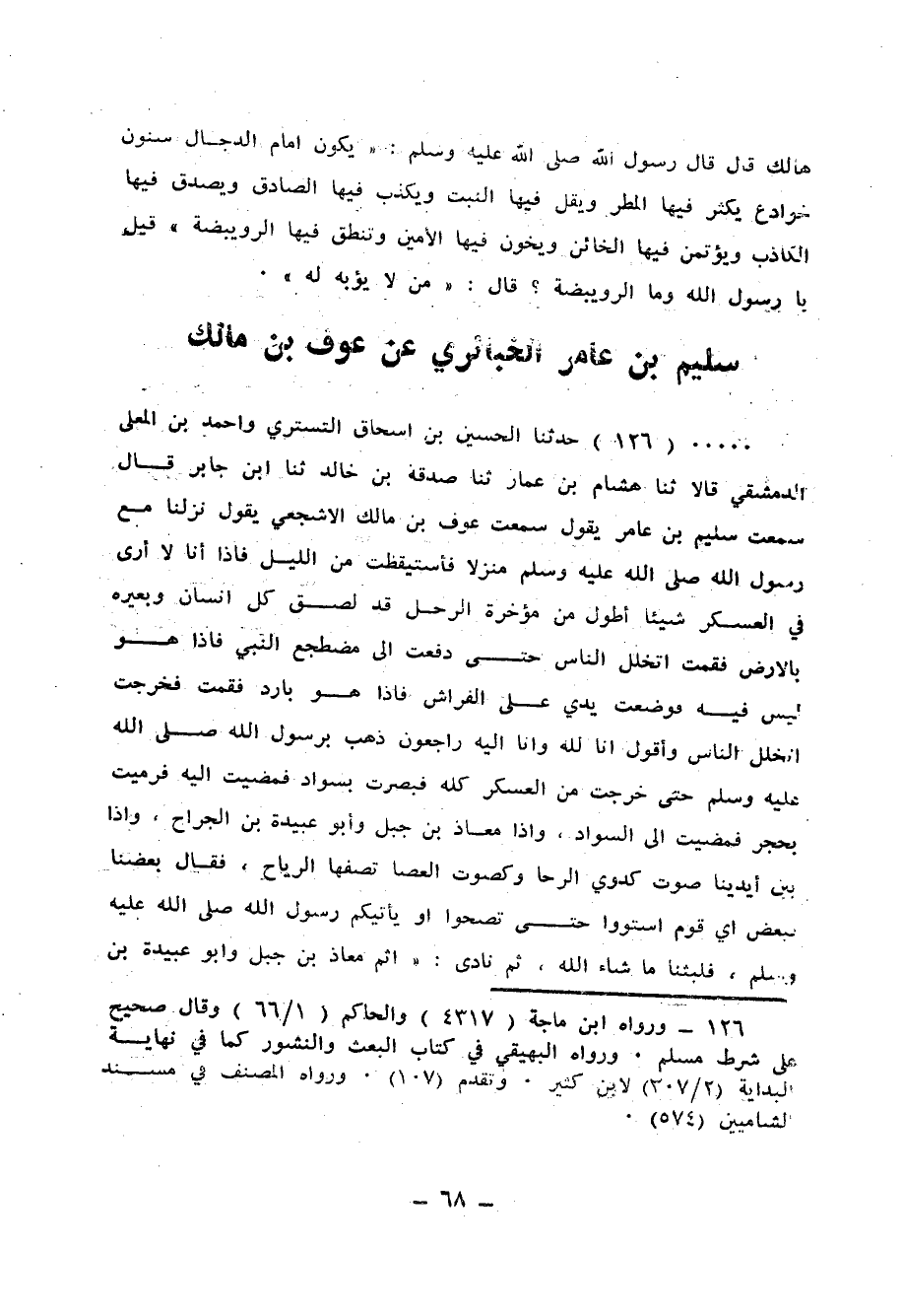 126 - حَدَّثَنَا الْحُسَيْنُ بْنُ إِسْحَاقَ التُّسْتَرِيُّ، وَأَحْمَدُ بْنُ الْمُعَلَّى الدِّمَشْقِيُّ، قَالَا: ثنا هِشَامُ بْنُ عَمَّارٍ، ثنا صَدَقَةُ بْنُ خَالِدٍ، ثنا ابْنُ جَابِرٍ، قَالَ: سَمِعْتُ سُلَيْمَ بْنَ عَامِرٍ يَقُولُ: سَمِعْتُ عَوْفَ بْنَ مَالِكٍ الْأَشْجَعِيَّ يَقُولُ: نَزَلْنَا مَعَ رَسُولِ اللهِ صَلَّى اللهُ عَلَيْهِ وَسَلَّمَ مَنْزِلًا فَاسْتَيْقَظْتُ مِنَ اللَّيْلِ، فَإِذَا أَنَا لَا أَرَى فِي الْعَسْكَرِ شَيْئًا أَطْوَلَ مِنْ مُؤْخِرَةِ الرَّحْلِ، قَدْ لُصِقَ كُلُّ إِنْسَانٍ وَبَعِيرُهُ بِالْأَرْضِ، فَقُمْتُ أَتَخَلَّلُ النَّاسَ حَتَّى دَفَعْتُ إِلَى مُضْطَجِعِ النَّبِيِّ، فَإِذَا هُوَ لَيْسَ فِيهِ، فَوَضَعْتُ يَدَيَّ عَلَى الْفِرَاشِ، فَإِذَا هُوَ بَارِدٌ، فَقُمْتُ فَخَرَجْتُ أَتَخَلَّلُ النَّاسَ وَأَقُولُ: إِنَّا لِلَّهِ وَإِنَّا إِلَيْهِ رَاجِعُونَ، ذُهِبَ بِرَسُولِ اللهِ صَلَّى اللهُ عَلَيْهِ وَسَلَّمَ حَتَّى خَرَجْتُ مِنَ الْعَسْكَرِ كُلِّهِ، فَبَصَرْتُ بِسَوَادٍ فَمَضَيْتُ إِلَيْهِ فَرَمَيْتُ بِحَجَرٍ فَمَضَيْتُ إِلَى السَّوَادِ، وَإِذَا مُعَاذُ بْنُ جَبَلٍ وَأَبُو عُبَيْدَةَ بْنُ الْجَرَّاحِ، وَإِذَا بَيْنَ أَيْدِينَا صَوْتٌ كَدَوِيِّ الرَّحَى، وكَصَوْتِ الْعَصَا تَصِفَهَا الرِّيَاحُ، فَقَالَ بَعْضُنَا لِبَعْضٍ: أَيْ قَوْمٌ اسْتَوُوا حَتَّى تَصْحُوا أَوْ يَأْتِيَكُمْ رَسُولُ اللهِ صَلَّى اللهُ عَلَيْهِ وَسَلَّمَ، فَلَبِثْنَا مَا شَاءَ اللهُ ثُمَّ نَادَى: «أَثَمَّ مُعَاذُ بْنُ جَبَلٍ وَأَبُو عُبَيْدَةَ بْنُ الْجَرَّاحِ وَعَوْفُ بْنُ مَالِكٍ؟» قُلْنَا: نَعَمْ، فَأَقْبَلَ إِلَيْنَا حَتَّى كُنَّا مَعَهُ لَا نَسْأَلَهُ شَيْئًا وَلَا يُخْبِرْنَا حَتَّى قَعَدَ عَلَى فِرَاشِهِ فَقَالَ: «أَتَدْرُونَ مَا خَيَّرَنِي رَبِّي اللَّيْلَةَ؟» قُلْنَا: اللهُ وَرَسُولُهُ أَعْلَمُ قَالَ: «فَإِنَّهُ §خَيَّرَنِي بَيْنَ أَنْ يَدْخُلَ نِصْفُ أُمَّتِي الْجَنَّةَ وَبَيْنَ الشَّفَاعَةِ فَاخْتَرْتُ الشَّفَاعَةَ» قُلْنَا: يَا رَسُولَ اللهِ، ادْعُ اللهَ أَنْ يَجْعَلَنَا مِنْ أَهْلِهَا، قَالَ: «هِيَ لِكُلِّ مُسْلِمٍ»