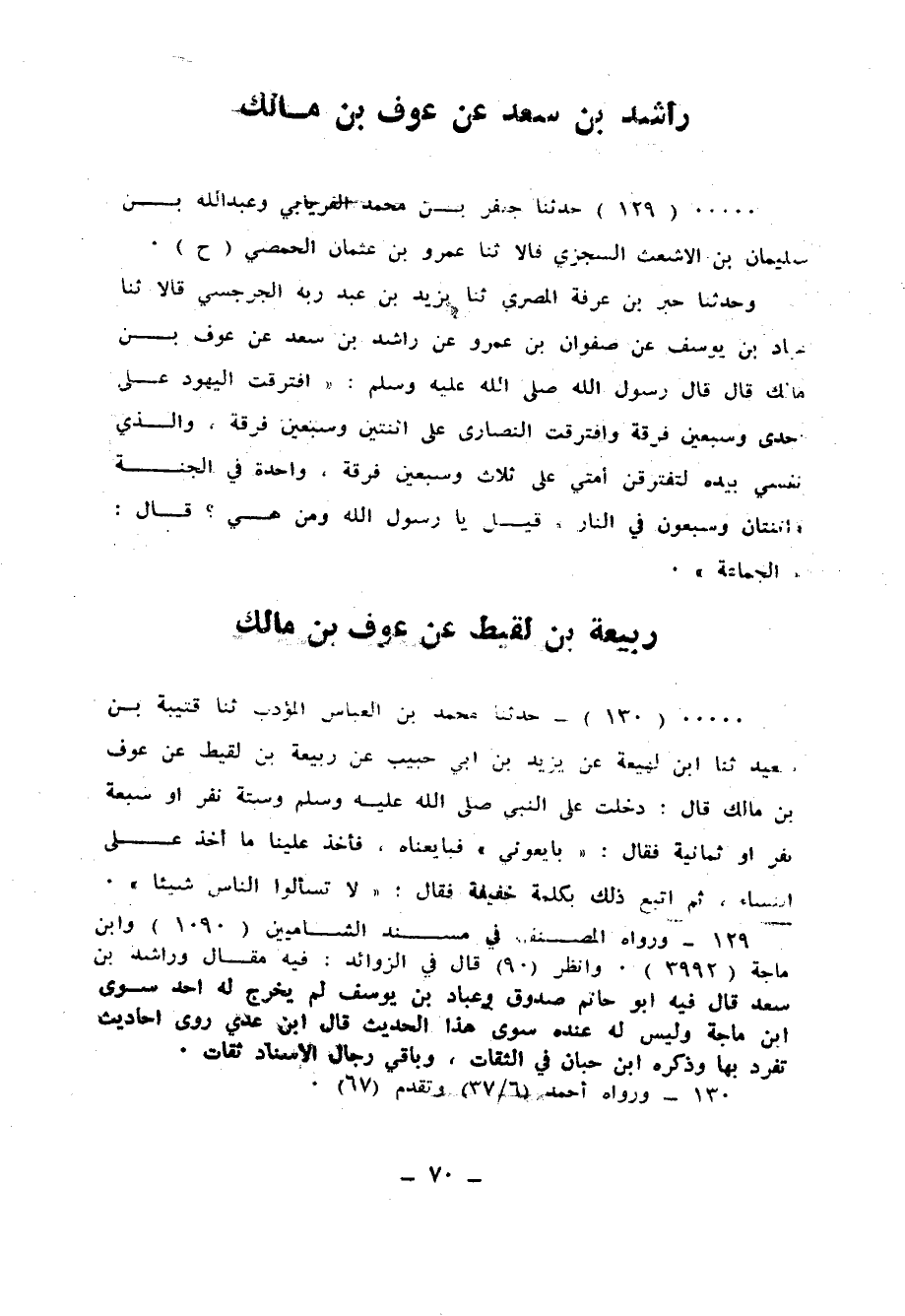129 - حَدَّثَنَا جَعْفَرُ بْنُ مُحَمَّدٍ الْفِرْيَابِيُّ، وَعَبْدُ اللهِ بْنُ سُلَيْمَانَ بْنِ الْأَشْعَثِ السِّجْزِيُّ، قَالَا: ثنا عَمْرُو بْنُ عُثْمَانَ الْحِمْصِيُّ، ح وَحَدَّثَنَا جَبْرُ بْنُ عَرَفَةَ الْمِصْرِيُّ، ثنا يَزِيدُ بْنُ عَبْدِ رَبِّهِ الْجُرْجُسِيُّ، قَالَا: ثنا عَبَّادُ بْنُ يُوسُفَ، عَنْ صَفْوَانَ بْنِ عَمْرٍو، عَنْ رَاشِدِ بْنِ سَعْدٍ، عَنْ عَوْفِ بْنِ مَالِكٍ قَالَ: قَالَ رَسُولُ اللهِ صَلَّى اللهُ عَلَيْهِ وَسَلَّمَ: «§افْتَرَقَتِ الْيَهُودُ عَلَى إِحْدَى وَسَبْعِينَ فِرْقَةً، وَافْتَرَقَتِ النَّصَارَى عَلَى اثْنَتَيْنِ وَسَبْعِينَ فِرْقَةً، وَالَّذِي نَفْسِي بِيَدِهِ لَتَفْتَرِقَنَّ أُمَّتِي عَلَى ثَلَاثٍ وَسَبْعِينَ فِرْقَةً وَاحِدَةٌ فِي الْجَنَّةِ، وَاثْنَتَانِ وَسَبْعُونَ فِي النَّارِ» قِيلَ: يَا رَسُولَ اللهِ، وَمَنْ هِيَ؟ قَالَ: «الْجَمَاعَةُ»