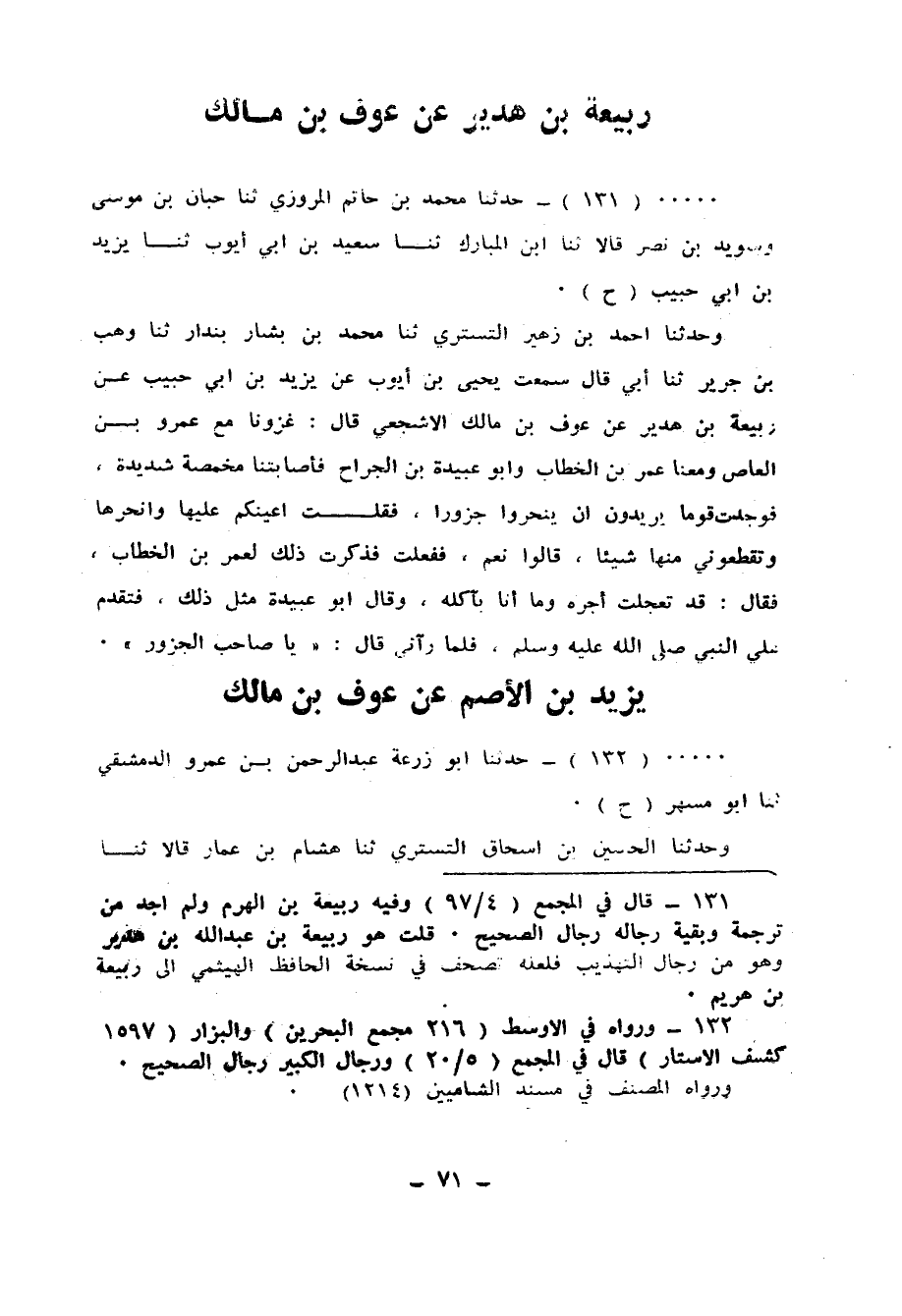 131 - حَدَّثَنَا مُحَمَّدُ بْنُ حَاتِمٍ الْمَرْوَزِيُّ، ثنا حَبَّانُ بْنُ مُوسَى، وَسُوَيْدُ بْنُ نَصْرٍ، قَالَا: ثنا ابْنُ الْمُبَارَكِ، ثنا سَعِيدُ بْنُ أَبِي أَيُّوبَ، ثنا يَزِيدُ بْنُ أَبِي حَبِيبٍ، ح وَحَدَّثَنَا أَحْمَدُ بْنُ زُهَيْرٍ التُّسْتَرِيُّ، ثنا مُحَمَّدُ بْنُ بَشَّارٍ بُنْدَارٌ، ثنا وَهْبُ بْنُ جَرِيرٍ، ثنا أَبِي قَالَ: سَمِعْتُ يَحْيَى بْنَ أَيُّوبَ، عَنْ يَزِيدَ بْنِ أَبِي حَبِيبٍ، عَنْ رَبِيعَةَ بْنِ هُدَيْرٍ، عَنْ عَوْفِ بْنِ مَالِكٍ الْأَشْجَعِيِّ قَالَ: غَزَوْنَا مَعَ عَمْرِو بْنِ الْعَاصِ وَمَعَنَا عُمَرُ بْنُ الْخَطَّابِ وَأَبُو عُبَيْدَةَ بْنُ الْجَرَّاحِ، فَأَصَابَتْنَا مَخْمَصَةٌ شَدِيدَةٌ، فَوَجَدْتُ قَوْمًا يُرِيدُونَ أَنْ يَنْحَرُوا جَزُورًا فَقُلْتُ: أُعِيْنُكُمْ عَلَيْهَا وَأَنْحَرُهَا وَتُقْطِعُونِي مِنْهَا شَيْئًا؟ قَالُوا: نَعَمْ، فَفَعَلْتُ، فَذَكَرْتُ ذَلِكَ لِعُمَرَ بْنِ الْخَطَّابِ فَقَالَ: قَدْ تَعَجَّلْتَ أَجْرَهُ، وَمَا أَنَا بِآكِلِهِ، وَقَالَ أَبُو عُبَيْدَةَ مِثْلَ ذَلِكَ، فَتَقَدَّمَ عَلَيَّ النَّبِيُّ صَلَّى اللهُ عَلَيْهِ وَسَلَّمَ فَلَمَّا رَآنِي قَالَ: «§يَا صَاحِبَ الْجَزُورِ»