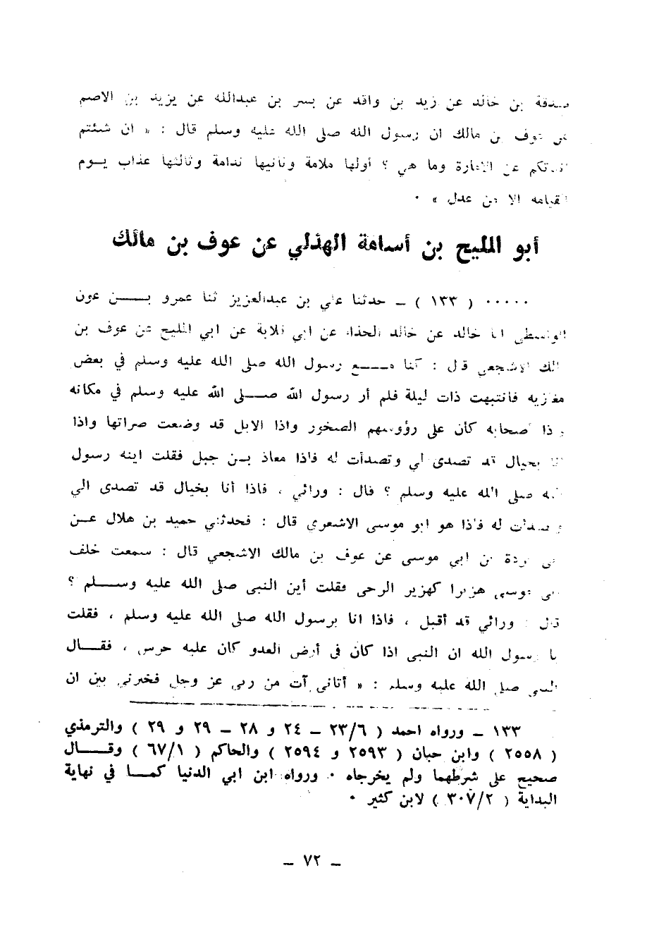 133 - حَدَّثَنَا عَلِيُّ بْنُ عَبْدِ الْعَزِيزِ، ثنا عَمْرُو بْنُ عَوْن الْوَاسِطِيُّ، أنا خَالِدٌ، عَنْ خَالِدٍ الْحَذَّاءِ، عَنْ أَبِي قِلَابَةَ، عَنْ أَبِي الْمَلِيحِ، عَنْ عَوْفِ بْنِ مَالِكٍ الْأَشْجَعِيِّ قَالَ: كُنَّا مَعَ رَسُولِ اللهِ صَلَّى اللهُ عَلَيْهِ وَسَلَّمَ فِي بَعْضِ مَغَازِيهِ، فَانْتَبَهْتُ ذَاتَ لَيْلَةٍ فَلَمْ أَرَ رَسُولَ اللهِ صَلَّى اللهُ عَلَيْهِ وَسَلَّمَ فِي مَكَانِهِ، وَإِذَا أَصْحَابُهُ كَأَنَّ عَلَى رُءُوسِهِمُ الصُّخُورَ، وَإِذَا الْإِبِلُ قَدْ وَضَعَتْ صَرَاتَهَا، وَإِذَا أَنَا بِخَيَالٍ قَدْ تَصَدَّى لِي، وَتَصَدَّأْتُ لَهُ، فَإِذَا مُعَاذُ بْنُ جَبَلٍ فَقُلْتُ: أَيْنَهُ رَسُولُ اللهِ صَلَّى اللهُ عَلَيْهِ وَسَلَّمَ؟ قَالَ: وَرَائِي، فَإِذَا أَنَا بِخَيَالٍ قَدْ تَصَدَّى إِلَيَّ وَتَصَدَّأْتُ لَهُ، فَإِذَا هُوَ أَبُو مُوسَى الْأَشْعَرِيُّ قَالَ: فَحَدَّثَنِي حُمَيْدُ بْنُ هِلَالٍ، عَنْ أَبِي بُرْدَةَ بْنِ أَبِي مُوسَى، عَنْ عَوْفِ بْنِ مَالِكٍ الْأَشْجَعِيِّ قَالَ: سَمِعْتُ خَلْفَ أَبِي مُوسَى هَزِيرًا كَهَزِيرِ الرَّحَى فَقُلْتُ: أَيْنَ النَّبِيُّ صَلَّى اللهُ عَلَيْهِ وَسَلَّمَ؟ قَالَ: وَرَائِي قَدْ أَقْبَلَ، فَإِذَا أَنَا بِرَسُولِ اللهِ صَلَّى اللهُ عَلَيْهِ وَسَلَّمَ، فَقُلْتُ: يَا رَسُولَ اللهِ، إِنَّ النَّبِيَّ إِذَا كَانَ فِي أَرْضِ الْعَدُوِّ كَانَ عَلَيْهِ حَرَسٌ، فَقَالَ النَّبِيُّ صَلَّى اللهُ عَلَيْهِ وَسَلَّمَ: «§أَتَانِي آتٍ مِنْ رَبِّي عَزَّ وَجَلَّ فَخَيَّرَنِي بَيْنَ أَنْ يَدْخُلَ نِصْفُ أُمَّتِي الْجَنَّةَ وَبَيْنَ الشَّفَاعَةِ فَاخْتَرْتُ الشَّفَاعَةَ» قَالَ مُعَاذٌ: بِأَبِي أَنْتَ وَأُمِّي قَدْ عَرَفْتَ قَرَابَتِي وَمَنْزِلَتِي فَاجْعَلْنِي مِنْهُمْ، فَقَالَ: «أَنْتَ مِنْهُمْ» فَقَالَ عَوْفٌ وَأَبُو مُوسَى: يَا رَسُولَ اللهِ، قَدْ عَرَفْتَ إِنَّا تَرَكْنَا أَهْلِنَا نُؤْثِرُ اللهَ وَرَسُولَهُ، فَاجْعَلْنَا مِنْهُمْ، قَالَ: «هِيَ لِكُلِّ مُسْلِمٍ أَنْتُمَا مِنْهُمْ» فَانْتَهَيْنَا إِلَى الْقَوْمِ حِينَ نَادُوا فَقَالَ النَّبِيُّ صَلَّى اللهُ عَلَيْهِ وَسَلَّمَ: «اقْعُدُوا» فَقَعَدُوا كَأَنَّ أَحَدًا لَمْ يَقُمْ، فَقَالَ النَّبِيُّ صَلَّى اللهُ عَلَيْهِ وَسَلَّمَ: «أَتَانِي آتٍ مِنْ رَبِّي فَخَيَّرَنِي بَيْنَ أَنْ يَدْخُلَ شِطْرُ أُمَّتِي وَبَيْنَ الشَّفَاعَةِ فَاخْتَرْتُ الشَّفَاعَةَ» فَقَالَ الْقَوْمُ: يَا رَسُولَ اللهِ اجْعَلْنَا مِنْهُمْ، فَقَالَ رَسُولُ اللهِ صَلَّى اللهُ عَلَيْهِ وَسَلَّمَ: «أَنْصِتُوا» فَأَنْصَتُوا كَأَنَّ أَحَدًا لَمْ يَتَكَلَّمْ، فَقَالَ رَسُولُ اللهِ صَلَّى اللهُ عَلَيْهِ وَسَلَّمَ: «إِنَّ شَفَاعَتِي لِمَنْ مَاتَ لَا يُشْرِكُ بِاللهِ شَيْئًا»