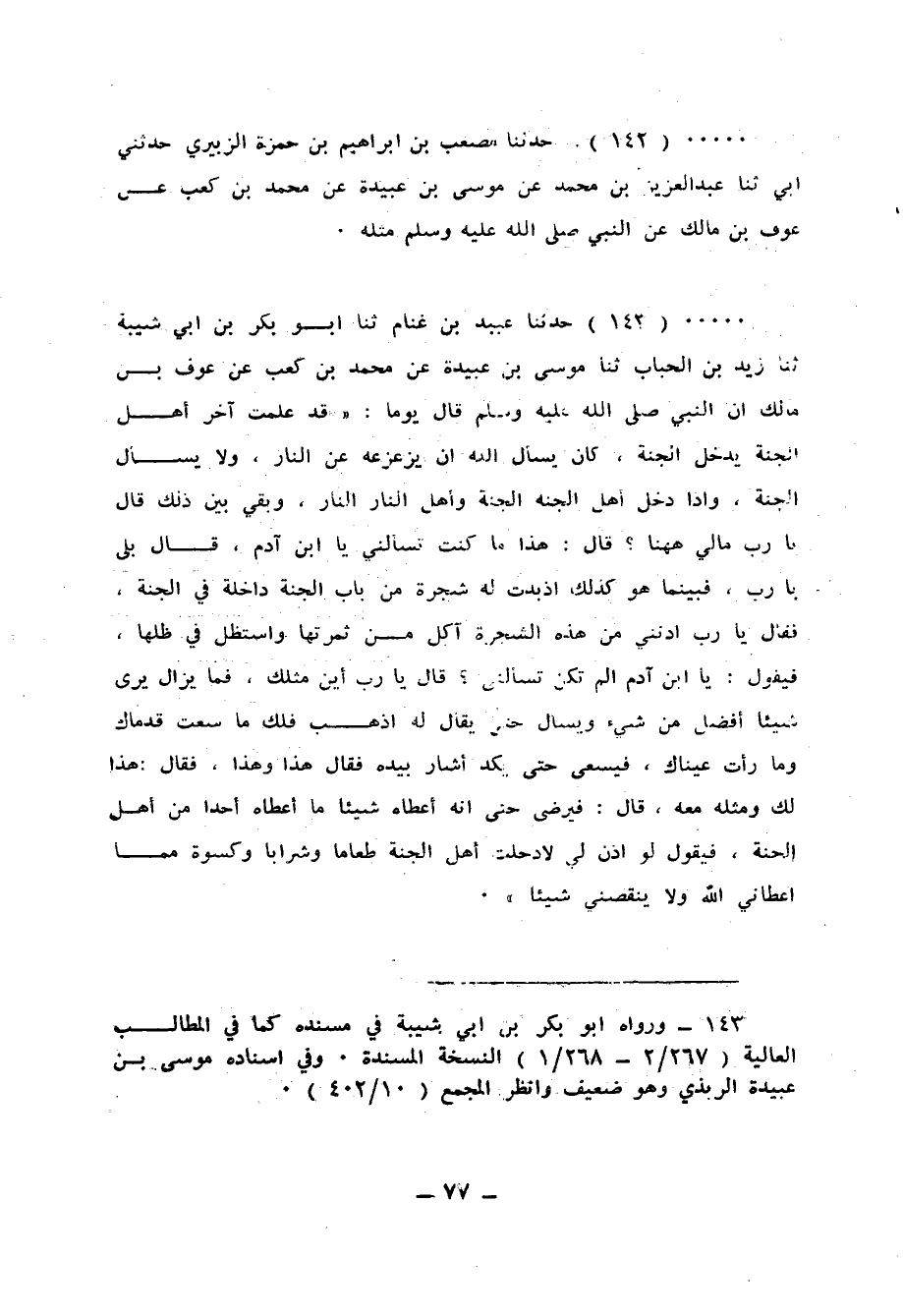 143 - حَدَّثَنَا عُبَيْدُ بْنُ غَنَّامٍ، ثنا أَبُو بَكْرِ بْنُ أَبِي شَيْبَةَ، ثنا زَيْدُ بْنُ الْحُبَابِ، ثنا مُوسَى بْنُ عُبَيْدَةَ، عَنْ مُحَمَّدِ بْنِ كَعْبٍ، عَنْ عَوْفِ بْنِ مَالِكٍ، أَنَّ النَّبِيَّ صَلَّى اللهُ عَلَيْهِ وَسَلَّمَ قَالَ يَوْمًا: " قَدْ عَلِمْتُ آخِرَ أَهْلِ الْجَنَّةِ يَدْخُلُ الْجَنَّةَ، كَانَ يَسْأَلُ اللهَ أَنْ يُزَعْزِعْهُ عَنِ النَّارِ وَلَا يَسْأَلُ الْجَنَّةَ، وَإِذَا دَخَلَ أَهْلُ الْجَنَّةِ الْجَنَّةَ، وَأَهْلُ النَّارِ النَّارَ وَبَقِيَ بَيْنَ ذَلِكَ قَالَ: يَا رَبِّ مَالِي هَهُنَا؟ قَالَ: هَذَا مَا كُنْتَ تَسْأَلُنِي يَا ابْنَ آدَمَ قَالَ: بَلَى يَا رَبِّ، فَبَيْنَمَا هُوَ كَذَلِكَ إِذْ بَدَتْ لَهُ شَجَرَةً مِنْ بَابِ الْجَنَّةِ دَاخِلَةً فِي الْجَنَّةِ فَقَالَ: يَا رَبِّ، أَدْنِنِي مِنْ هَذِهِ الشَّجَرَةِ، آكُلُ مِنْ ثَمَرَتِهَا، وَأَسْتَظِلُّ فِي ظِلِّهَا، فَيَقُولُ: §يَا ابْنَ آدَمَ أَلَمْ تَكُنْ تَسْأَلْنِي؟ قَالَ: يَا رَبِّ، أَيْنَ مِثْلُكَ؟ فَمَا يَزَالُ يَرَى شَيْئًا أَفْضَلَ مِنْ شَيْءٍ، وَيَسْأَلُ حَتَّى يُقَالُ لَهُ: " اذْهَبْ فَلَكَ مَا سَعَتْ قَدَمَاكَ وَمَا رَأَتْ عَيْنَاكَ، فَيَسْعَى حَتَّى يَكَّدَ أَشَارَ بِيَدِهِ، فَقَالَ: هَذَا وَهَذَا فَقَالَ: هَذَا لَكَ وَمِثْلُهُ مَعَهُ قَالَ: فَيَرْضَى حَتَّى أَنَّهُ أَعْطَاهُ شَيْئًا مَا أَعْطَاهُ أَحَدًا مِنْ أَهْلِ الْجَنَّةِ فَيَقُولُ: لَوْ أَذِنَ لِي لَأَدْخَلْتُ أَهْلَ الْجَنَّةِ طَعَامًا وَشَرَابًا وَكِسْوَةً، مِمَّا أَعْطَانِي اللهُ وَلَا يُنْقِصُنِي شَيْئًا "