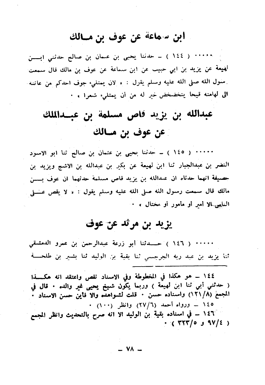 145 - حَدَّثَنَا يَحْيَى بْنُ عُثْمَانَ بْنِ صَالِحٍ، ثنا أَبُو الْأَسْوَدِ النَّضْرُ بْنُ عَبْدِ الْجَبَّارِ، ثنا ابْنُ لَهِيعَةَ، عَنْ بُكَيْرِ بْنِ عَبْدِ اللهِ بْنِ الْأَشَجِّ، وَيَزِيدَ بْنِ حُصَيْفَةَ، أَنَّهُمَا حَدَّثَاهُ، أَنَّ عَبْدَ اللهِ بْنَ يَزِيدَ قَاصَّ مَسْلَمَةَ حَدَّثَهُمَا، أَنَّ عَوْفَ بْنَ مَالِكٍ قَالَ: سَمِعْتُ رَسُولَ اللهِ صَلَّى اللهُ عَلَيْهِ وَسَلَّمَ يَقُولُ: «§لَا يَقُصُّ عَلَى النَّاسِ إِلَّا أَمِيرٌ أَوْ مَأْمُورٌ أَوْ مُحْتَالٌ»