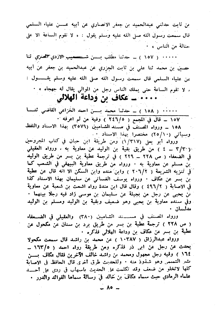 157 - حَدَّثَنَا مُطَّلِبُ بْنُ شُعَيْبٍ الْأَزْدِيُّ الْمِصْرِيُّ، ثنا حُصَيْنُ بْنُ مُحَمَّدٍ، ثنا عَلِيُّ بْنُ ثَابِتٍ الْجَزَرِيُّ، عَنْ عَبْدِ الْحَمِيدِ بْنِ جَعْفَرٍ، عَنْ أَبِيهِ، عَنْ عَلْيَاءَ السُّلَمِيِّ قَالَ: سَمِعْتُ رَسُولَ اللهِ صَلَّى اللهُ عَلَيْهِ وَسَلَّمَ يَقُولُ: " §لَا تَقُومُ السَّاعَةُ حَتَّى يَمْلِكَ النَّاسَ رَجُلٌ مِنَ الْمَوَالِي، يُقَالُ لَهُ: جَهْجَاهُ "