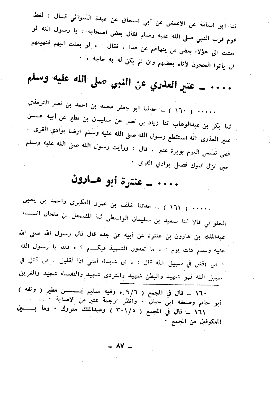 160 - حَدَّثَنَا أَبُو جَعْفَرٍ مُحَمَّدُ بْنُ أَحْمَدَ بْنِ نَصْرٍ التِّرْمِذِيُّ، ثنا أَبُو بَكْرِ بْنُ عَبْدِ الْوَهَّابِ، ثنا زِيَادُ بْنُ نَصْرٍ، عَنْ سُلَيْمِ بْنِ مَطِيرٍ، عَنْ أَبِيهِ، عَنْ عُتَيْرٍ الْعُذْرِيِّ، «أَنَّهُ §اسْتَقْطَعَ رَسُولَ اللهِ صَلَّى اللهُ عَلَيْهِ وَسَلَّمَ أَرْضًا بِوَادِي الْقُرَى فَهِيَ تُسَمَّى الْيَوْمَ بُوَيْرَةُ عُتَيْرٍ» ، قَالَ: «وَرَأَيْتُ رَسُولَ اللهِ صَلَّى اللهُ عَلَيْهِ وَسَلَّمَ حِينَ نَزَلَ تَبُوكَ فَصَلَّى بِوَادِي الْقُرَى»