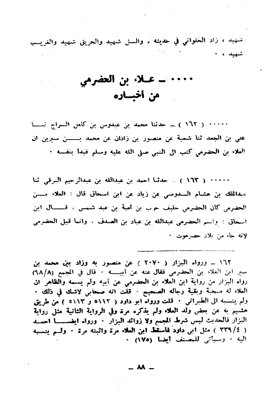 163 - حَدَّثَنَا أَحْمَدُ بْنُ عَبْدِ اللهِ بْنِ عَبْدِ الرَّحِيمِ الْبَرْقِيُّ، ثنا عَبْدُ الْمَلِكِ بْنُ هِشَامٍ السَّدُوسِيُّ، عَنْ زِيَادٍ، عَنِ ابْنِ إِسْحَاقَ قَالَ: الْعَلَاءُ بْنُ الْحَضْرَمِيِّ، «§كَانَ الْحَضْرَمِيُّ حَلِيفَ حَرْبِ بْنِ أُمَيَّةَ بْنِ عَبْدِ شَمْسٍ» ، قَالَ ابْنُ إِسْحَاقَ: وَاسْمُ الْحَضْرَمِيِّ عَبْدُ اللهِ بْنُ عَبَّادِ بْنِ الصَّدَفِ وَإِنَّمَا قِيلَ الْحَضْرَمِيُّ لِأَنَّهُ جَاءَ مِنْ بِلَادِ حَضْرَمَوْتَ