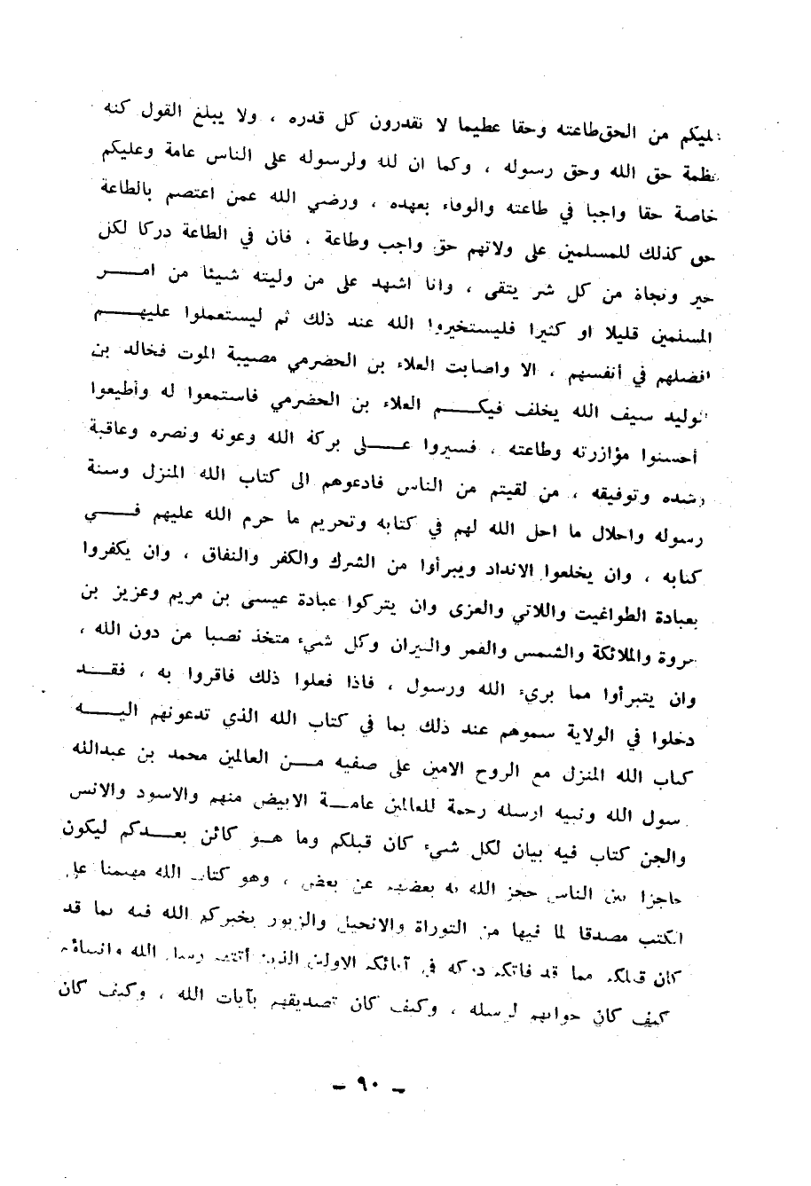 فَإِنَّ عَلَيْكُمْ مِنَ الْحَقِّ طَاعَتَهُ ، وَحَقًا عَظِيمًا لاَ تَقْدُرُونَ كُلَّ قَدْرِهِ وَلاَ يَبْلُغُ الْقَوْلُ كُلُّهُ عَظَمَةَ حَقِّ اللهِ وَحَقِّ رَسُولِهِ ، وَكَمَا أَنَّ لِلَّهِ وَلِرَسُولِهِ عَلَى النَّاسِ عَامَّةً وَعَلَيْكُمْ خَاصَّةً حَقًّا وَاجِبًا فِي طَاعَتِهِ وَالْوَفَاءِ بِعَهْدِهِ وَرَضِي اللَّهُ عَمَّنِ اعْتَصَمَ بِالطَّاعَةِ ، حَقٌّ كَذَلِكَ لِلْمُسْلِمِينَ عَلَى وُلاتِهِمْ حَقٌّ وَاجِبٌ وَطَاعَةٌ ، فَإِنَّ فِي الطَّاعَةِ دَرَكًا لِكُلِّ خَيْرٍ وَنَجَاةً مِنْ كُلِّ شَرٍّ يُتَّقَى ، وَأَنَا أَشْهَدُ عَلَى مَنْ وَلَّيْتُهُ شَيْئًا مِنْ أَمْرِ الْمُسْلِمِينَ قَلِيلاً ، أَوْ كَثِيرًا ، فَلْيَسْتَخِيرُوا اللَّهَ عِنْدَ ذَلِكَ ثُمَّ لِيَسْتَعْمِلُوا عَلَيْهِمْ أَفْضَلَهُمْ فِي أَنْفُسِهِمْ ، إِلاَّ وَأَصَابَتِ الْعَلاَءَ بْنَ الْحَضْرَمِيِّ مُصِيبَةُ الْمَوْتِ فخالدُّ بْنُ الْوَلِيدِ سَيْفُ اللهِ يَخْلُفُ فِيكُمُ الْعَلاَءَ بْنَ الْحَضْرَمِيِّ فَاسْتَمِعُوا لَهُ وَأَطِيعُوا ، وَأَحْسِنُوا مُؤَازَرَتَهُ وَطَاعَتَهُ ، فَسِيرُوا عَلَى بَرَكَةِ اللهِ وَعَوْنِهِ ، وَنَصْرِهِ ، وَعَاقِبَةِ رُشْدِهِ ، وَتَوْفِيقِهِ ، مَنْ لَقِيتُمْ مِنَ النَّاسِ فَادْعُوهُمْ إِلَى كِتَابِ اللهِ الْمُنَزَّلِ وَسُنَّةِ رَسُولِهِ وَإِحْلاَلِ مَا أَحَلَّ اللَّهُ لَهُمْ فِي كِتَابِهِ ، وَتَحْرِيمِ مَا حَرَّمَ اللَّهُ عَلَيْهِمْ فِي كِتَابِهِ ، وَأَنْ يَخْلَعُوا الأَنْدَادَ وَيَبْرَأُوا مِنَ الشِّرْكِ وَالْكُفْرِ وَالنِّفَاقِ ، وَأَنْ يَكْفُرُوا بِعِبَادَةِ الطَّوَاغِيتِ وَاللاَّتِ وَالْعُزَّى ، وَأَنْ يَتْرُكُوا عُبَادَةَ عِيسَى ابْنِ مَرْيَمَ وَعُزَيرِ بْنِ مَرْوَةَ وَالْمَلاَئِكَةِ وَالشَّمْسِ وَالْقَمَرِ وَالنِّيرَانِ وَكُلِّ شَيْءٍ مُتَّخَذِ نَصَبًا مِنْ دُونِ اللهِ ، وَأَنْ يَتَبَرَّأُوا مِمَّا بَرِئَ اللَّهُ وَرَسُولُهُ ، فَإِذَا فَعَلُوا ذَلِكَ فَأَقَرُّوا بِهِ فَقَدْ دَخَلُوا فِي الْوَلاَيَةِ سَمُّوهُمْ عِنْدَ ذَلِكَ بِمَا فِي كِتَابِ اللهِ الَّذِي تَدْعُونَهُمْ إِلَيْهِ كِتَابُ اللهِ الْمُنَزَّلُ مَعَ الرُّوحِ الأَمِينِ عَلَى صَفِيَّهِ مِنَ الْعَالَمِينَ مُحَمَّدِ بْنِ عَبْدِ اللهِ رَسُولِ اللهِ ونَبِيِّهِ أَرْسَلَهُ رَحْمَةً لِلْعَالَمِينَ عَامَّةً ، الأَبْيَضِ مِنْهُمُ وَالأَسْوَدِ ، وَالإِنْسِ وَالْجِنِّ ، كِتَابٌ فِيهِ بَيَانٌ لِكُلِّ شَيْءٍ كَانَ قَبْلَكُمْ ، وَمَا هُوَ كَائِنٌ بَعْدَكُمْ لِيَكُونَ حَاجِزًا بَيْنَ النَّاسِ حَجَزَ اللَّهُ بِهِ بَعْضَهُمْ عَنْ بَعْضٍ وَهُوَ كِتَابُ اللهِ مُهَيْمِنًا عَلَى الْكُتُبِ مُصَدِّقًا لَمَا فِيهِ مِنَ التَّوْرَاةِ وَالإِنْجِيلِ وَالزَّبُورِ ، يُخْبِرَكُمُ اللَّهُ فِيهِ بِمَا قَدْ كَانَ قَبْلَكُمْ مِمَّا قَدْ فَاتَكُمْ دَرَكُهُ فِي آبَائِكُمُ الأَوَّلِينَ الَّذِينَ أَتَتَّهِمْ رُسُلُ اللهِ وَأَنْبِيَاؤُهُ ، وَكَيْفَ كَانَ جَوَابُهُمْ لِرُسُلِهِ ، وَكَيْفَ كَانَ تَصْدِيقُهُمْ بِآيَاتِ اللهِ ،