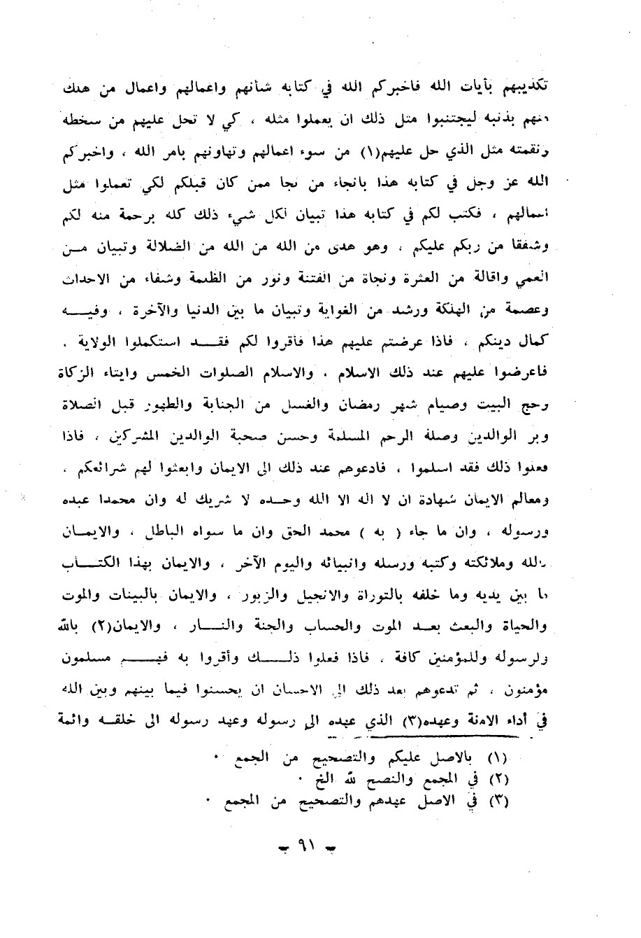 وَكَيْفَ كَانَ تَكْذِيبُهُمْ بِآيَاتِ اللهِ ، فَأَخْبَرَكُمُ اللَّهُ فِي كِتَابِهِ شَأْنَهُمْ وَأَعْمَالَهُمْ وَأعْمَالَ مَنْ هَلَكَ مِنْهُمْ بِذَنَبِهِ لِيَجْتَنِبُوا مِثْلَ ذَلِكَ ، أَنْ يَعْمَلُوا مِثْلَهُ كَيْ لاَ تَحِلَّ عَلَيْهِمْ مِنْ سَخَطِهِ وَنِقْمَتِهِ مِثْلُ الَّذِي حَلَّ عَلَيْهِمْ مِنْ سُوءِ أَعْمَالِهِمْ وَتَهَاوُنِهِمْ بِأَمْرِ اللهِ ، وَأَخْبَرَكُمُ اللَّهُ عَزَّ وَجَلَّ فِي كِتَابِهِ هَذَا بِإِنْجَاءِ مَنْ نَجَا مِمَّنْ كَانَ قَبْلَكُمْ لِكَيْ تَعْمَلُوا مِثْلَ أَعْمَالِهِمْ فَكَتَبَ لَكُمْ هَذَا تِبْيَانًا لِكُلِّ شَيْءٍ ، ذَلِكَ كُلُّهُ بِرَحْمَةٍ مِنْهُ لَكُمْ وَشَفَقَةٍ مِنْ رَبِّكُمْ عَلَيْكُمْ ، وَهُوَ هُدًى مِنَ اللهِ مِنَ الضَّلاَلَةِ وَتِبْيَانٌ مِنَ الْعَمَى ، وَإِقَالَةٌ مِنَ الْعَثْرَةِ ، وَنَجَاةٌ مِنَ الْفِتْنَةِ ، وَنَوِّرٌ مِنَ الظُّلْمَةِ ، وَشِفَاءٌ مِنَ الأَحْدَاثِ ، وَعِصْمَةٌ مِنَ الْهَلَكَةِ ، وَرُشْدٌ مِنَ الْغِوَايَةِ ، وتِبْيَانُ مَا بَيْنَ الدُّنْيَا وَالآخِرَةِ ، وَفِيهِ كَمَالُ دِينِكُمْ ، فَإِذَا عَرَضْتُمْ هَذَا فَأَقَرُّوا لَكُمْ فَقَدِ اسْتَكْمَلُوا الْوَلاَيَةَ فَاعْرِضُوا عَلَيْهِمْ عِنْدَ ذَلِكَ الإِسْلاَمَ ، وَالإِسْلاَمُ : الصَّلَوَاتُ الْخَمْسُ ، وَإِيتَاءُ الزَّكَاةِ ، وَحَجُّ الْبَيْتِ ، وَصِيَامُ شَهْرِ رَمَضَانَ ، وَالْغُسْلُ مِنَ الْجَنَابَةِ ، وَالطُّهُورُ قَبْلَ الصَّلاَةِ ، وَبِرُّ الْوَالِدَيْنِ ، وَصِلَةُ الرَّحِمِ الْمُسْلِمَةِ ، وَحَسَنُ صُحْبَةِ الْوَالِدَيْنِ الْمُشْرِكِينِ ، فَإِذَا فَعَلُوا ذَلِكَ فَقَدْ أَسْلَمُوا فَادْعُوهُمْ عِنْدَ ذَلِكَ إِلَى الإِيمَانِ ، وَابْعَثُوا لَهُمْ شَرَائِعَكُمْ ، وَمَعَالِمُ الإِيمَانِ : شَهَادَةُ أَنَّ لاَ إِلَهَ إِلاَّ اللَّهُ لاَ شَرِيكَ لَهُ ، وَأَنَّ مُحَمَّدًا عَبْدُهُ وَرَسُولُهُ ، وَإِنَّ مَا جَاءَ بِهِ مُحَمَّدٌ الْحَقَّ وَإِنَّ مَا سِوَاهُ الْبَاطِلُ ، وَالإِيمَانُ بِاللَّهِ ، وَمَلاَئِكَتِهِ ، وَكُتُبِهِ ، وَرُسُلِهِ ، وَأَنْبِيَائِهِ ، وَالْيَوْمِ الآخِرِ ، وَالإِيمَانُ بِهَذَا الْكِتَابِ مَا بَيْنَ يَدَيْهِ ، وَمَا خَلْفِهِ بِالتَّوْرَاةِ وَالإِنْجِيلِ وَالزَّبُورِ ، وَالإِيمَانُ بِالْبَيِّنَاتِ ، وَالْمَوْتِ ، وَالْحَيَاةِ ، وَالْبَعْثِ بَعْدَ الْمَوْتِ ، وَالْحِسَابِ ، وَالْجَنَّةِ ، وَالنَّارِ ، وَالنُّصْحُ لِلَّهِ وَلِرَسُولِهِ وَلِلْمُؤْمِنِينَ كَافَّةً ، فَإِذَا فَعَلُوا ذَلِكَ وَأَقَرُّوا بِهِ فَهُمْ مُسْلِمُونَ مُؤْمِنُونَ ، ثُمَّ تَدْعُوهُمْ بَعْدَ ذَلِكَ إِلَى الإِحْسَانِ أَنْ يُحْسِنُوا فِيمَا بَيْنَهُمْ وَبَيْنَ اللهِ فِي أَدَاءِ الأَمَانَةِ وَعَهْدِهِ الَّذِي عَهِدَهُ إِلَى رَسُولِهِ وَعَهْدِ رَسُولِهِ إِلَى خَلْقِهِ وَأَئِمَّةِ الْمُؤْمِنِينَ ،