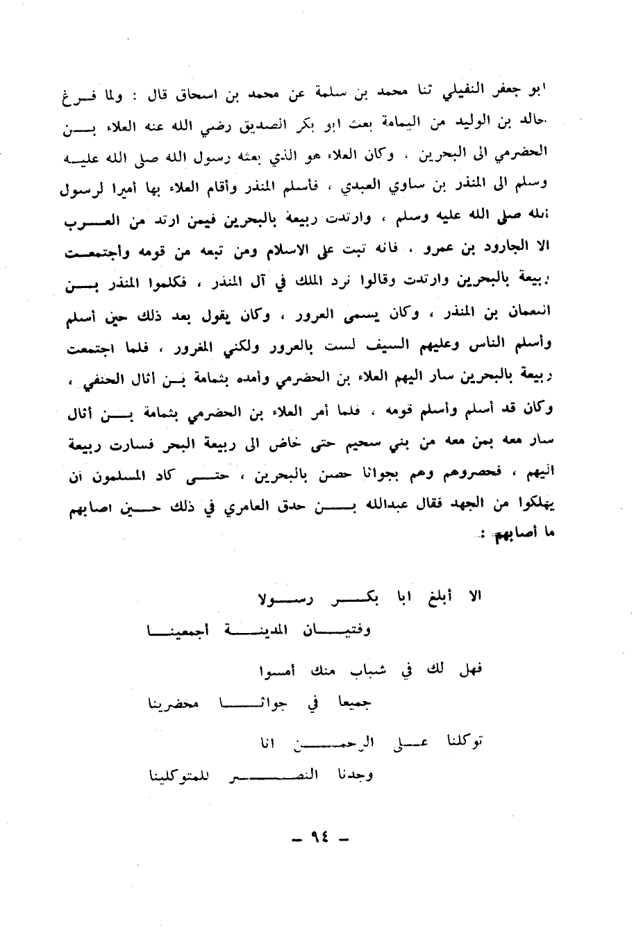 أَبُو جَعْفَرٍ النُّفَيْلِيُّ، ثنا مُحَمَّدُ بْنُ سَلَمَةَ، عَنْ مُحَمَّدِ بْنِ إِسْحَاقَ، قَالَ: " §وَلَمَّا فَرَغَ خَالِدُ بْنُ الْوَلِيدِ مِنَ الْيَمَامَةِ بَعَثَ أَبُو بَكْرٍ الصِّدِّيقُ رَضِي اللهُ عَنْهُ الْعَلَاءَ بْنَ الْحَضْرَمِيِّ إِلَى الْبَحْرَيْنِ وَكَانَ الْعَلَاءُ هُوَ الَّذِي بَعَثَهُ رَسُولُ اللهِ صَلَّى اللهُ عَلَيْهِ وَسَلَّمَ إِلَى الْمُنْذِرِ بْنِ سَاوَى الْعَبْدِيِّ فَأَسْلَمَ الْمُنْذِرُ وَأَقَامَ الْعَلَاءُ بِهَا أَمِيرًا لِرَسُولِ اللهِ صَلَّى اللهُ عَلَيْهِ وَسَلَّمَ وَارْتَدَّتْ رَبِيعَةُ بِالْبَحْرَيْنِ فِيمَنِ ارْتَدَّ مِنَ الْعَرَبِ إِلَّا الْجَارُودَ بْنَ عَمْرٍو فَإِنَّهُ ثَبَتَ عَلَى الْإِسْلَامِ وَمَنْ تَبِعَهُ مِنْ قَوْمِهِ وَاجْتَمَعَتْ رَبِيعَةُ بِالْبَحْرَيْنِ وَارْتَدَّتْ وَقَالُوا: نَرُدُّ الْمُلْكَ فِي آلِ الْمُنْذِرِ فَكَلَّمُوا الْمُنْذِرَ بْنَ النُّعْمَانِ بْنِ الْمُنْذِرِ وَكَانَ يُسَمَّى الْعَرُورُ وَكَانَ يَقُولُ بَعْدَ ذَلِكَ حِينَ أَسْلَمَ وَأَسْلَمَ النَّاسُ وَعَلَيْهِمُ السَّيْفُ: لَسْتُ بِالْعَرُورِ وَلَكِنِّي الْمَغْرُورُ فَلَمَّا اجْتَمَعَتْ رَبِيعَةُ بِالْبَحْرَيْنِ سَارَ إِلَيْهِمُ الْعَلَاءُ بْنُ الْحَضْرَمِيِّ وَأَمَدَّهُ بِثُمَامَةَ بْنِ أُثَالٍ الْحَنَفِيِّ وَكَانَ قَدْ أَسْلَمَ وَأَسْلَمَ قَوْمُهُ، فَلَمَّا أُمِرَ الْعَلَاءُ بْنُ الْحَضْرَمِيِّ بِثُمَامَةَ بْنِ أُثَالٍ سَارَ مَعَهُ بِمَنْ مَعَهُ مِنْ بَنِي سُحَيْمٍ حَتَّى خَاضَ إِلَى رَبِيعَةَ الْبَحْرِ فَسَارَتْ رَبِيعَةُ إِلَيْهِمْ فَحَصَرُوهُمْ وَهُمْ بِجوَاثَا حِصْنٌ بِالْبَحْرَيْنِ حَتَّى كَادَ الْمُسْلِمُونَ أَنْ يَهْلَكُوا مِنَ الْجَهْدِ، فَقَالَ عَبْدُ اللهِ بْنُ حَدَقٍ الْعَامِرِيُّ فِي ذَلِكَ حِينَ أَصَابَهُمْ مَا أَصَابَهُمْ: