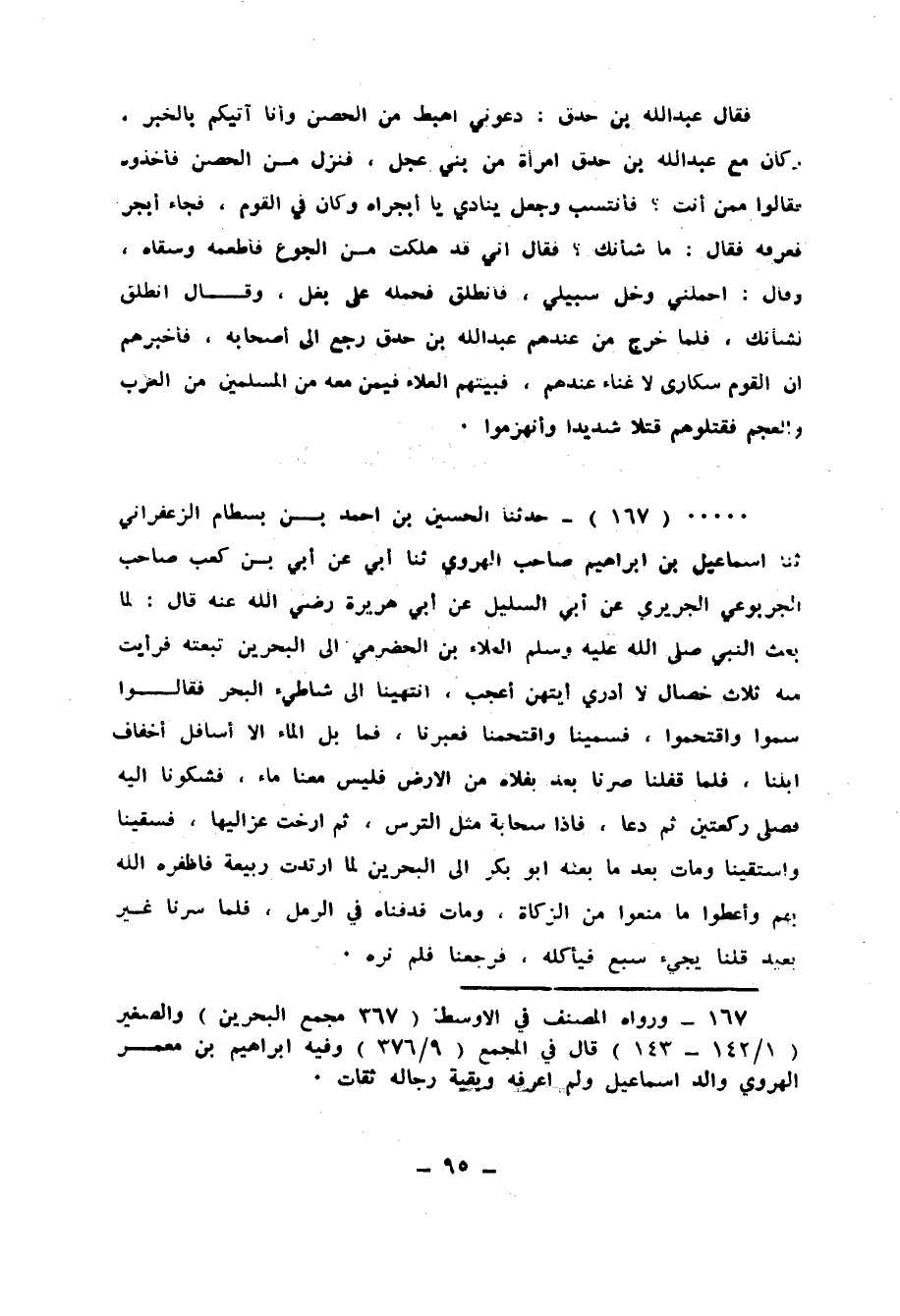 167 - حَدَّثَنَا الْحُسَيْنُ بْنُ أَحْمَدَ بْنِ بِسْطَامٍ الزَّعْفَرَانِيُّ، ثنا إِسْمَاعِيلُ بْنُ إِبْرَاهِيمَ صَاحِبُ الْهَرَوِيِّ، ثنا أَبِي، عَنْ أُبَيِّ بْنِ كَعْبٍ، صَاحِبِ الْجَرْبُوعِيِّ الْجُرَيْرِيِّ، عَنْ أَبِي السَّلِيلِ، عَنْ أَبِي هُرَيْرَةَ رَضِي اللهُ عَنْهُ قَالَ: لَمَّا §بَعَثَ النَّبِيُّ صَلَّى اللهُ عَلَيْهِ وَسَلَّمَ الْعَلَاءَ بْنَ الْحَضْرَمِيِّ إِلَى الْبَحْرَيْنِ تَبِعْتُهُ، فَرَأَيْتُ مِنْهُ ثَلَاثَ خِصَالٍ، لَا أَدْرِي أَيَّتُهُنَّ أَعْجَبُ، انْتَهَيْنَا إِلَى شَاطِئِ الْبَحْرِ فَقَالُوا: سَمُّوا وَاقْتَحِمُوا، فَسَمَّيْنَا وَاقْتَحَمْنَا، فَعَبَرْنَا فَمَا بَلَّ الْمَاءُ إِلَّا أَسَافِلَ أَخْفَافِ إِبِلِنَا، فَلَمَّا قَفَلْنَا صِرْنَا بَعْدُ بِفَلَاةٍ مِنَ الْأَرْضِ فَلَيْسَ مَعَنَا مَاءٌ، فَشَكَوْنَا إِلَيْهِ فَصَلَّى رَكْعَتَيْنِ، ثُمَّ دَعَا، فَإِذَا سَحَابَةٌ مِثْلُ التُّرْسِ ثُمَّ أَرْخَتْ عَزَالِيَهَا فَسَقَيْنَا وَاسْتَقَيْنَا، وَمَاتَ بَعْدَ مَا بَعَثَهُ أَبُو بَكْرٍ إِلَى الْبَحْرَيْنِ، لَمَّا ارْتَدَّتْ رَبِيعَةُ، فَأَظْفَرَهُ اللهُ بِهِمْ وَأَعْطُوا مَا مَنَعُوا مِنَ الزَّكَاةِ، وَمَاتَ فَدَفَنَّاهُ فِي الرَّمْلِ فَلَمَّا سِرْنَا غَيْرَ بَعِيدٍ قُلْنَا: يَجِيءُ سَبْعٌ فَيَأْكُلُهُ فَرَجَعْنَا فَلَمْ نَرَهُ "