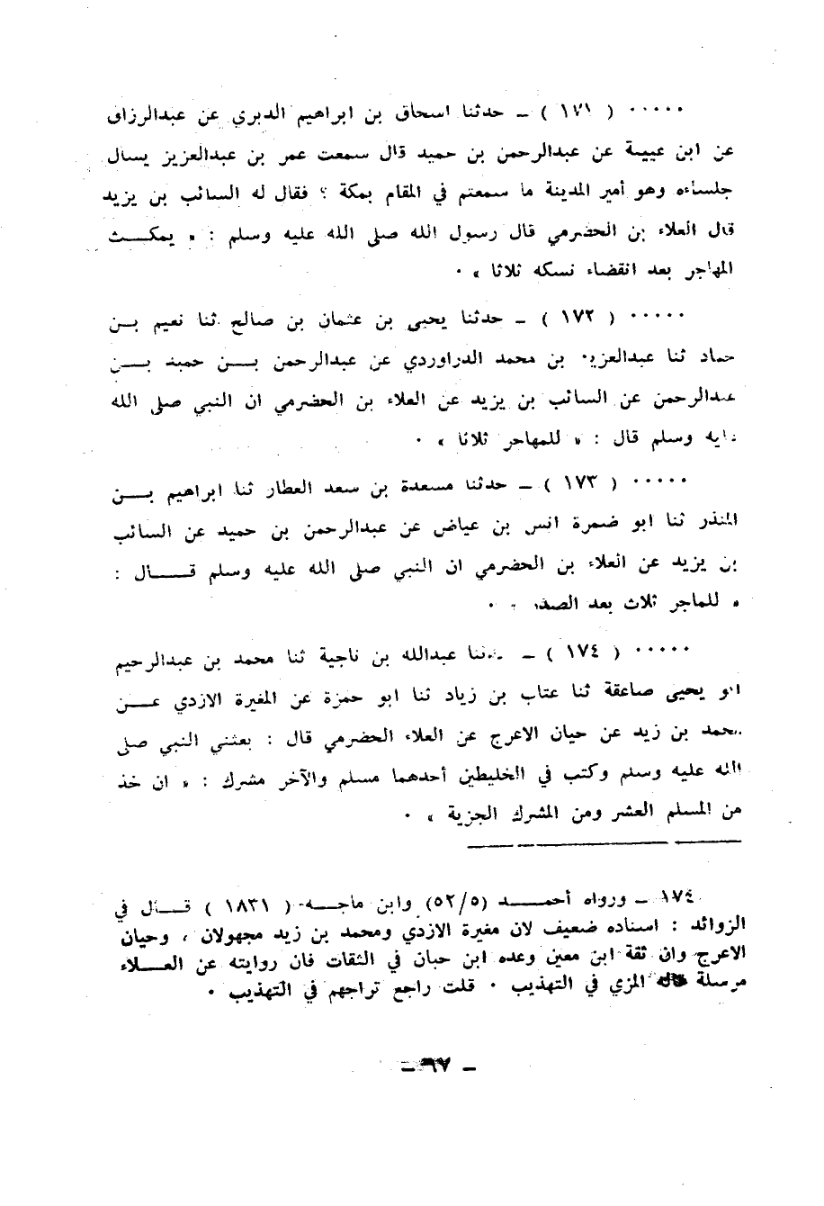 173 - حَدَّثَنَا مَسْعَدَةُ بْنُ سَعْدٍ الْعَطَّارُ، ثنا إِبْرَاهِيمُ بْنُ الْمُنْذِرِ، ثنا أَبُو ضَمْرَةَ أَنَسُ بْنُ عِيَاضٍ، عَنْ عَبْدِ الرَّحْمَنِ بْنِ حُمَيْدٍ، عَنِ السَّائِبِ بْنِ يَزِيدَ، عَنِ الْعَلَاءِ بْنِ الْحَضْرَمِيِّ، أَنَّ النَّبِيَّ صَلَّى اللهُ عَلَيْهِ وَسَلَّمَ قَالَ: «§لِلْمُهَاجِرِ ثَلَاثٌ بَعْدَ الصَّدْرِ»