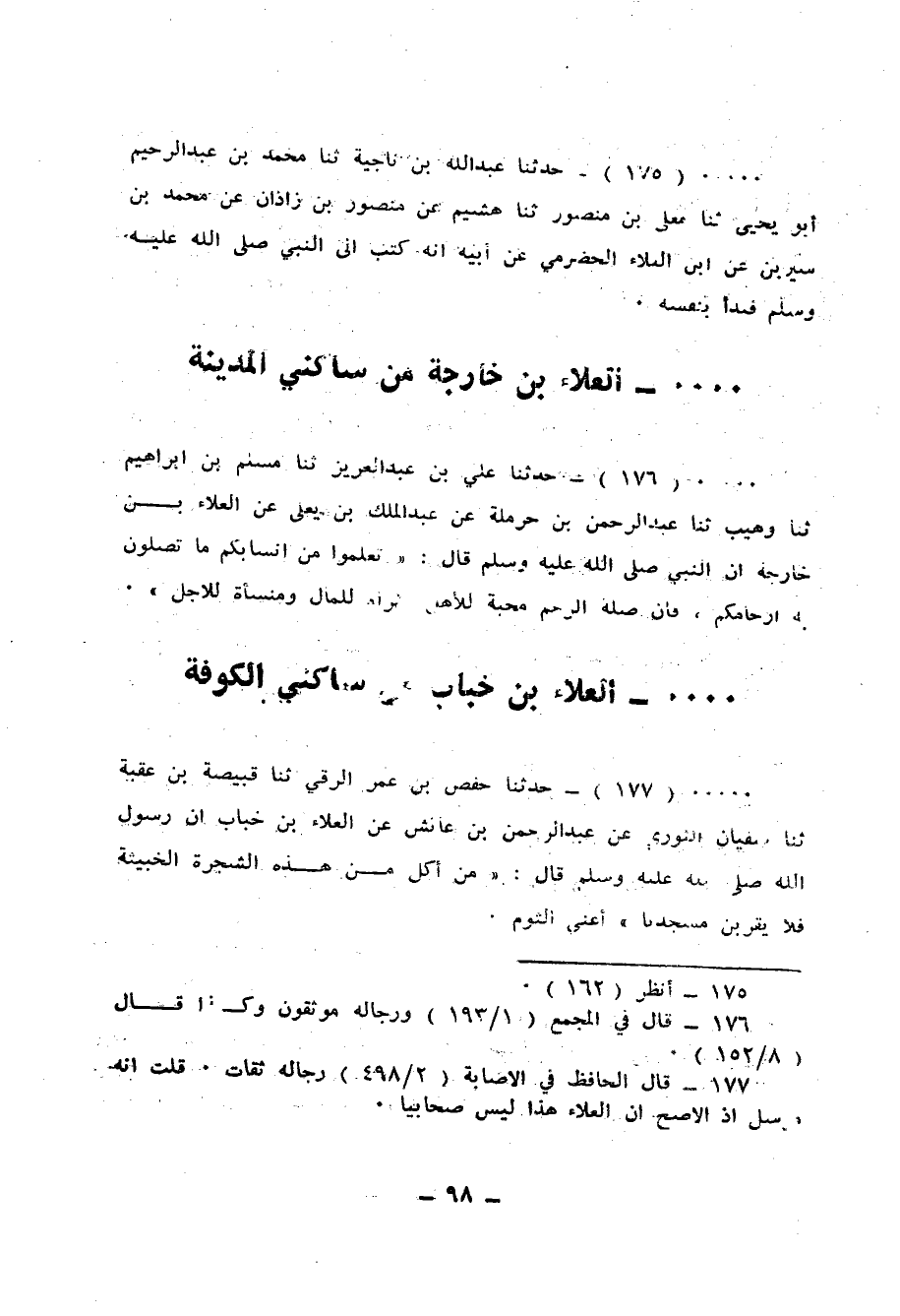 176 - حَدَّثَنَا عَلِيُّ بْنُ عَبْدِ الْعَزِيزِ، ثنا مُسْلِمُ بْنُ إِبْرَاهِيمَ، ثنا وُهَيْبٌ، ثنا عَبْدُ الرَّحْمَنِ بْنُ حَرْمَلَةَ، عَنْ عَبْدِ الْمَلِكِ بْنِ يَعْلَى، عَنِ الْعَلَاءِ بْنِ خَارِجَةَ، أَنَّ النَّبِيَّ صَلَّى اللهُ عَلَيْهِ وَسَلَّمَ قَالَ: «§تَعَلَّمُوا مِنْ أَنْسَابِكُمْ مَا تَصِلُونَ بِهِ أَرْحَامَكُمْ، فَإِنَّ صِلَةَ الرَّحِمِ مَحَبَّةٌ لِلْأَهْلِ، وَثَرَاءٌ لِلْمَالِ وَمَنْسَأَةٌ لِلْأَجَلِ»