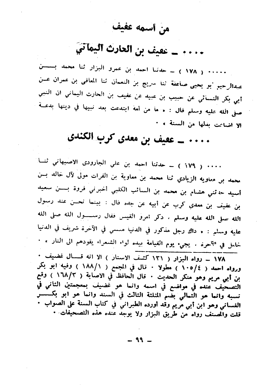 178 - حَدَّثَنَا أَحْمَدُ بْنُ عَمْرٍو الْبَزَّازُ، ثنا مُحَمَّدُ بْنُ عَبْدِ الرَّحِيمِ أَبُو يَحْيَى صَاعِقَةٌ، ثنا سُرَيْجُ بْنُ النُّعْمَانِ، ثنا الْمُعَافَى بْنُ عِمْرَانَ، عَنْ أَبِي بَكْرٍ الْغَسَّانِيِّ، عَنْ حَبِيبِ بْنِ عُبَيْدٍ، عَنْ عَفِيفِ بْنِ الْحَارِثِ الْيَمَانِيِّ، أَنَّ النَّبِيَّ صَلَّى اللهُ عَلَيْهِ وَسَلَّمَ قَالَ: «§مَا مِنْ أُمَّةٍ ابْتَدَعَتْ بَعْدَ نَبِيِّهَا فِي دِينِهَا بِدْعَةً إِلَّا أَضَاعَتْ بَدَلَهَا مِنَ السُّنَّةِ»