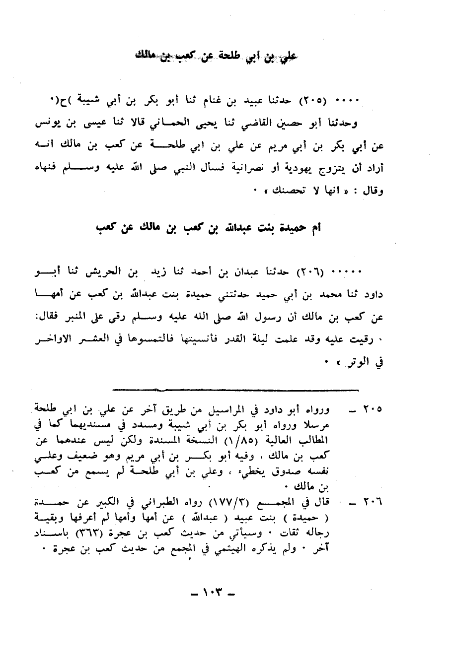 205 - حَدَّثَنَا عُبَيْدُ بْنُ غَنَّامٍ، ثنا أَبُو بَكْرِ بْنُ أَبِي شَيْبَةَ ح وَحَدَّثَنَا أَبُو حُصَيْنٍ الْقَاضِي، ثنا يَحْيَى الْحِمَّانِيُّ قَالَا: ثنا عِيسَى بْنُ يُونُسَ، عَنْ أَبِي بَكْرِ بْنِ أَبِي مَرْيَمَ، عَنْ عَلِيِّ بْنِ أَبِي طَلْحَةَ، عَنْ كَعْبِ بْنِ مَالِكٍ، أَنَّهُ أَرَادَ أَنْ يَتَزَوَّجَ يَهُودِيَّةً أَوْ نَصْرَانِيَّةً فَسَأَلَ النَّبِيَّ صَلَّى اللهُ عَلَيْهِ وَسَلَّمَ فَنَهَاهُ، وَقَالَ: «§إِنَّهَا لَا تُحْصِنُكَ»
