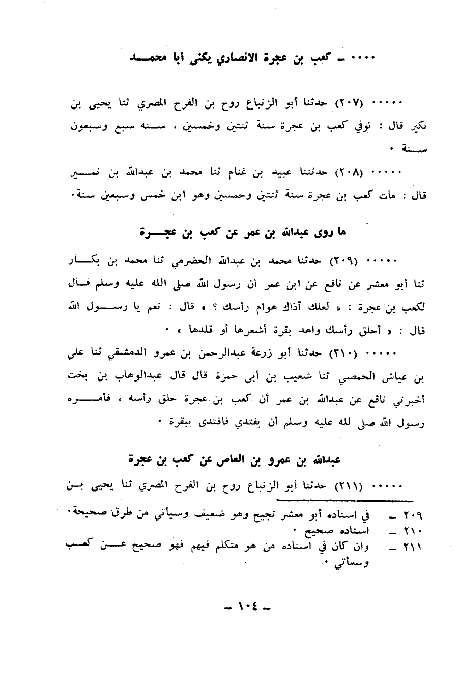 207 - حَدَّثَنَا أَبُو الزِّنْبَاعِ رَوْحُ بْنُ الْفَرَجِ الْمِصْرِيُّ، ثنا يَحْيَى بْنُ بُكَيْرٍ، قَالَ: «§تُوُفِّيَ كَعْبُ بْنُ عُجْرَةَ سَنَةَ ثِنْتَيْنِ وَخَمْسِينَ، سِنُّهُ سَبْعٌ وَسَبْعُونَ سَنَةً»
