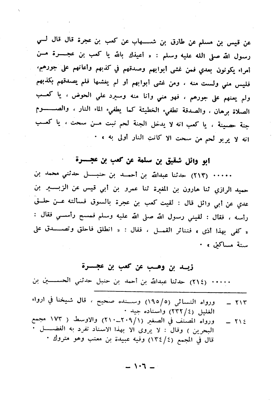 213 - حَدَّثَنَا عَبْدُ اللهِ بْنُ أَحْمَدَ بْنِ حَنْبَلٍ، حَدَّثَنِي مُحَمَّدُ بْنُ حُمَيْدٍ الرَّازِيُّ، ثنا هَارُونُ بْنُ الْمُغِيرَةِ، ثنا عَمْرُو بْنُ أَبِي قَيْسٍ، عَنِ الزُّبَيْرِ بْنِ عَدِيٍّ، عَنْ أَبِي وَائِلٍ، قَالَ: لَقِيتُ كَعْبَ بْنَ عُجْرَةَ بِالسُّوقِ فَسَأَلْتُهُ عَنْ حَلْقِ رَأْسِهِ، فَقَالَ: لَقِيَنِي رَسُولُ اللهِ صَلَّى اللهُ عَلَيْهِ وَسَلَّمَ " §فَمَسَحَ رَأْسِي، فَقَالَ: «كَفَى بِهَذَا أَذًى» ، فَتَنَاثَرَ الْقَمْلُ، فَقَالَ: «انْطَلِقْ فَاحْلِقْ وَتَصَدَّقْ عَلَى سِتَّةِ مَسَاكِينٍ»