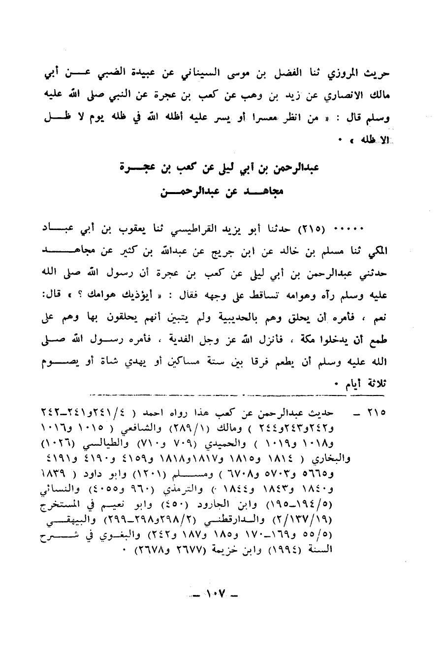 215 - حَدَّثَنَا أَبُو يَزِيدَ الْقَرَاطِيسِيُّ، ثنا يَعْقُوبُ بْنُ أَبِي عَبَّادٍ الْمَكِّيُّ، ثنا مُسْلِمُ بْنُ خَالِدٍ، عَنِ ابْنِ جُرَيْجٍ، عَنْ عَبْدِ اللهِ بْنِ كَثِيرٍ، عَنْ مُجَاهِدٍ، حَدَّثَنِي عَبْدُ الرَّحْمَنِ بْنُ أَبِي لَيْلَى، عَنْ كَعْبِ بْنِ عُجْرَة، أَنَّ رَسُولَ اللهِ صَلَّى اللهُ عَلَيْهِ وَسَلَّمَ رَآهُ وَهَوَامُّهُ تَسَّاقَطُ عَلَى وَجْهِهِ، فَقَالَ: «§أَيُؤْذِيكَ هَوَامُّكَ؟» ، قَالَ: نَعَمْ، فَأَمَرَهُ أَنْ يَحْلِقَ وَهُمْ بِالْحُدَيْبِيَةِ، وَلَمْ يَتَبَيَّنْ أَنَّهُمْ يَحْلِقُونَ بِهَا وَهُمْ عَلَى طَمَعٍ أَنْ يَدْخُلُوا مَكَّةَ، فَأَنْزَلَ اللهُ عَزَّ وَجَلَّ الْفِدْيَةَ، فَأَمَرَهُ رَسُولُ اللهِ صَلَّى اللهُ عَلَيْهِ وَسَلَّمَ أَنْ يُطْعِمَ فَرَقًا بَيْنَ سِتَّةِ مَسَاكِينٍ أَوْ يَهْدِيَ شَاةً أَوْ يَصُومَ ثَلَاثَةَ أَيَّامٍ "