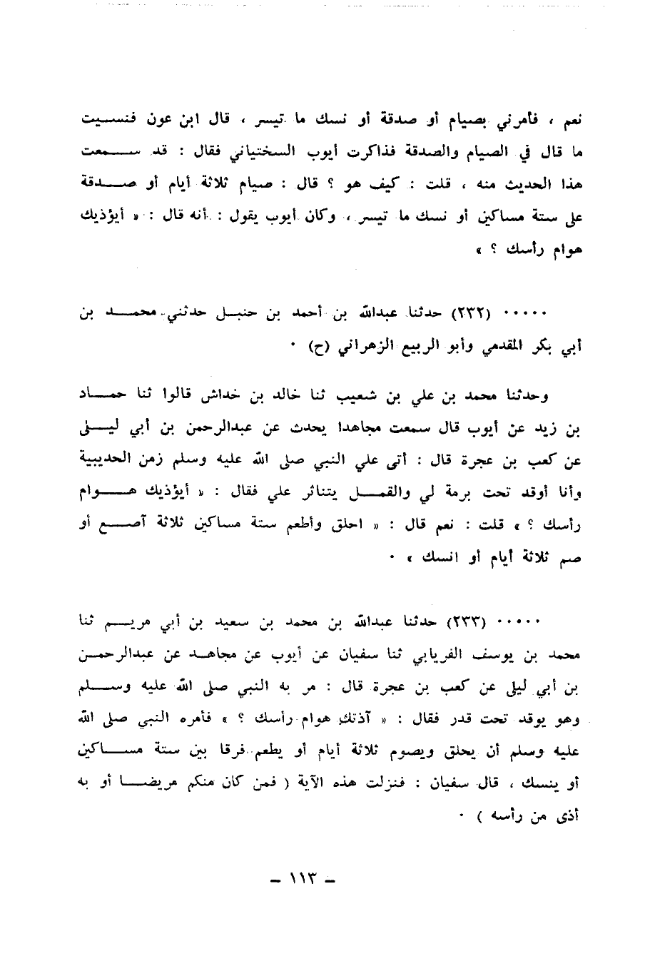 232 - حَدَّثَنَا عَبْدُ اللهِ بْنُ أَحْمَدَ بْنِ حَنْبَلٍ، حَدَّثَنِي مُحَمَّدُ بْنُ أَبِي بَكْرٍ الْمُقَدَّمِيُّ، وَأَبُو الرَّبِيعِ الزَّهْرَانِيُّ، ح وَحَدَّثَنَا مُحَمَّدُ بْنُ عَلِيِّ بْنِ شُعَيْبٍ، ثنا خَالِدُ بْنُ خِدَاشٍ، قَالُوا: ثنا حَمَّادُ بْنُ زَيْدٍ، عَنْ أَيُّوبَ، قَالَ: سَمِعْتُ مُجَاهِدًا، يُحَدِّثُ عَنْ عَبْدِ الرَّحْمَنِ بْنِ أَبِي لَيْلَى، عَنْ كَعْبِ بْنِ عُجْرَةَ، قَالَ: أَتَى عَلِيَّ النَّبِيُّ صَلَّى اللهُ عَلَيْهِ وَسَلَّمَ زَمَنَ الْحُدَيْبِيَةِ، وَأَنَا أُوقِدُ تَحْتَ بُرْمَةٍ لِي، وَالْقَمْلُ يَتَنَاثَرُ عَلِيَّ، فَقَالَ: «§أَيُؤْذِيكَ هَوَامُّ رَأْسِكَ؟» ، قُلْتُ: نَعَمْ، قَالَ: «احْلِقْ وَأَطْعِمْ سِتَّةَ مَسَاكِينٍ ثَلَاثَةَ آصُعٍ أَوْ صُمْ ثَلَاثَةَ أَيَّامٍ أَوِ انْسُكْ»