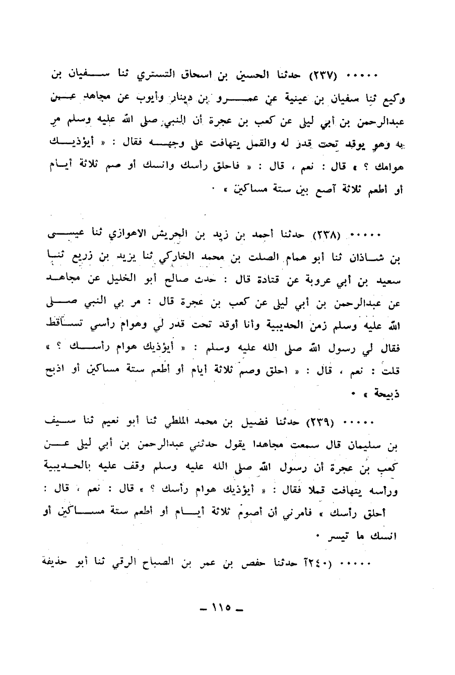 239 - حَدَّثَنَا فُضَيْلُ بْنُ مُحَمَّدٍ الْمَلْطِيُّ، ثنا أَبُو نُعَيْمٍ، ثنا سَيْفُ بْنُ سُلَيْمَانَ، قَالَ: سَمِعْتُ مُجَاهِدًا، يَقُولُ: حَدَّثَنِي عَبْدُ الرَّحْمَنِ بْنُ أَبِي لَيْلَى، عَنْ كَعْبِ بْنِ عُجْرَة، أَنَّ رَسُولَ اللهِ صَلَّى اللهُ عَلَيْهِ وَسَلَّمَ وَقَفَ عَلَيْهِ بِالْحُدَيْبِيَةِ وَرَأْسُهُ يَتَهَافَتُ قَمْلًا، فَقَالَ: «§أَيُؤْذِيكَ هَوَامُّ رَأْسِكَ؟» ، قَالَ: نَعَمْ، قَالَ: «احْلِقْ رَأْسَكَ» ، فَأَمَرَنِي أَنْ أَصُومَ ثَلَاثَةَ أَيَّامٍ أَوْ أُطْعِمَ سِتَّةَ مَسَاكِينٍ أَوْ أَنْسُكُ مَا تَيَسَّرَ.
