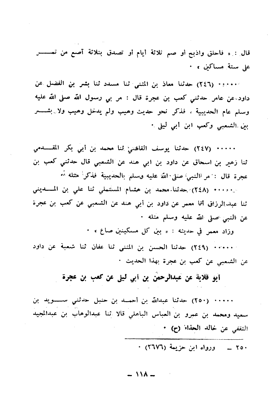 250 - حَدَّثَنَا عَبْدُ اللهِ بْنُ أَحْمَدَ بْنِ حَنْبَلٍ، حَدَّثَنِي سُوَيْدُ بْنُ سَعِيدٍ، وَمُحَمَّدُ بْنُ عَمْرِو بْنِ الْعَبَّاسِ الْبَاهِلِيُّ قَالَا: ثنا عَبْدُ الْوَهَّابِ بْنُ عَبْدِ الْمَجِيدِ الثَّقَفِيُّ، عَنْ خَالِدٍ الْحَذَّاءِ، ح وَحَدَّثَنَا مُحَمَّدُ بْنُ إِبْرَاهِيمَ بْنِ شَبِيبٍ الْعَسَّالُ الْأَصْبَهَانِيُّ، ثنا إِسْمَاعِيلُ بْنُ عَمْرٍو الْبَجَلِيُّ، ثنا الْعَبَّاسُ بْنُ الْفَضْلِ الْأَنْصَارِيُّ، عَنْ خَالِدٍ الْحَذَّاءِ، عَنْ أبِي قِلَابَةَ، عَنْ عَبْدِ الرَّحْمَنِ بْنِ أَبِي لَيْلَى، عَنْ كَعْبِ بْنِ عُجْرَة، أَنَّ رَسُولَ اللهِ صَلَّى اللهُ عَلَيْهِ وَسَلَّمَ قَالَ لَهُ، وَكَانَ هَوَامُّ رَأْسِهِ آذَتْهُ: «§اذْبَحْ شَاةً نُسُكًا، أَوْ صُمْ ثَلَاثَةَ أَيَّامٍ، أَوْ تَصَدَّقْ بِثَلَاثَةِ آصُعٍ عَلَى سِتَّةِ مَسَاكِينٍ»