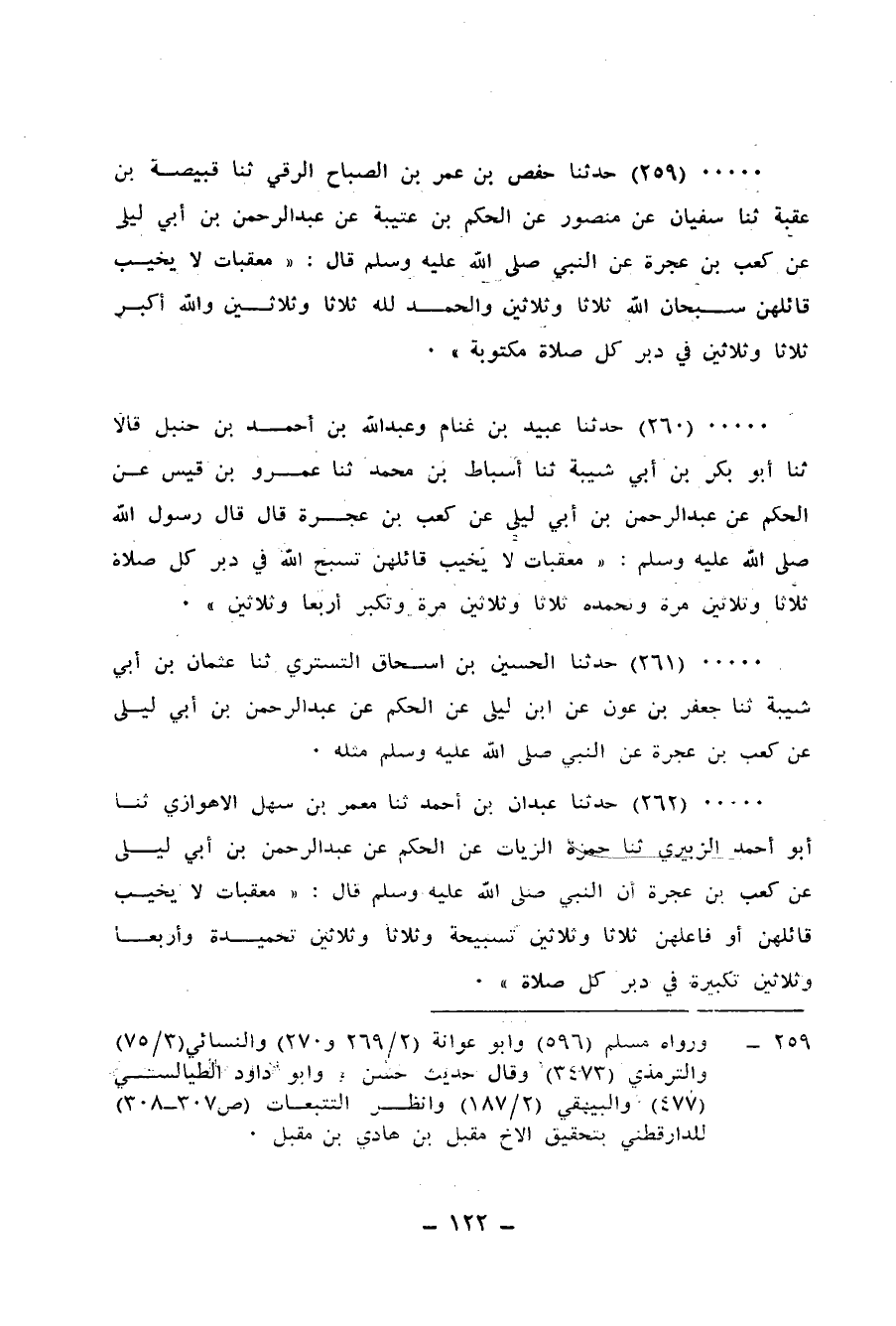 260 - حَدَّثَنَا عُبَيْدُ بْنُ غَنَّامٍ، وَعَبْدُ اللهِ بْنُ أَحْمَدَ بْنِ حَنْبَلٍ، قَالَا: ثنا أَبُو بَكْرِ بْنُ أَبِي شَيْبَةَ، ثنا أَسْبَاطُ بْنُ مُحَمَّدٍ، ثنا عَمْرُو بْنُ قَيْسٍ، عَنِ الْحَكَمِ، عَنْ عَبْدِ الرَّحْمَنِ بْنِ أَبِي لَيْلَى، عَنْ كَعْبِ بْنِ عُجْرَة، قَالَ: قَالَ رَسُولُ اللهِ صَلَّى اللهُ عَلَيْهِ وَسَلَّمَ: " §مُعَقِّبَاتٌ لَا يَخِيبُ قَائِلُهُنَّ: تُسَبِّحُ اللهَ فِي دُبُرِ كُلِّ صَلَاةٍ ثَلَاثًا وَثَلَاثِينَ مَرَّةً، وَتَحْمَدُهُ ثَلَاثًا وَثَلَاثِينَ مَرَّةً، وَتُكَبِّرُ أَرْبَعًا وَثَلَاثِينَ ".