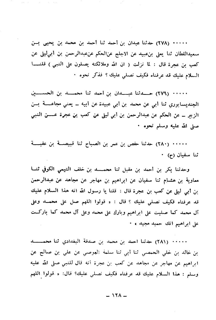 280 - حَدَّثَنَا حَفْصُ بْنُ عُمَرَ الصَّبَّاحُ، ثنا قَبِيصَةُ بْنُ عُقْبَةَ، ثنا سُفْيَانُ، ح وَحَدَّثَنَا بَكْرُ بْنُ أَحْمَدَ بْنِ مُقْبِلٍ، ثنا مُحَمَّدُ بْنُ خَلَفٍ التَّيْمِيُّ الْكُوفِيُّ، ثنا مُعَاوِيَةُ بْنُ هِشَامٍ، ثنا سُفْيَانُ، عَنْ إِبْرَاهِيمَ بْنِ مُهَاجِرٍ، عَنْ مُجَاهِدٍ، عَنْ عَبْدِ الرَّحْمَنِ بْنِ أَبِي لَيْلَى، عَنْ كَعْبِ بْنِ عُجْرَة، قَالَ: قُلْنَا: يَا رَسُولَ اللهِ إِنَّهُ هَذَا السَّلَامُ عَلَيْكَ قَدْ عَرَفْنَاهُ، §فَكَيْفَ نُصَلِّي عَلَيْكَ؟، قَالَ: " قُولُوا: اللهُمَّ صَلِّ عَلَى مُحَمَّدٍ وَعَلَى آلِ مُحَمَّدٍ كَمَا صَلَّيْتَ عَلَى إِبْرَاهِيمَ، وَبَارِكْ عَلَى مُحَمَّدٍ وَعَلَى آلِ مُحَمَّدٍ كَمَا بَارَكْتَ عَلَى إِبْرَاهِيمَ إِنَّكَ حَمِيدٌ مَجِيدٌ "