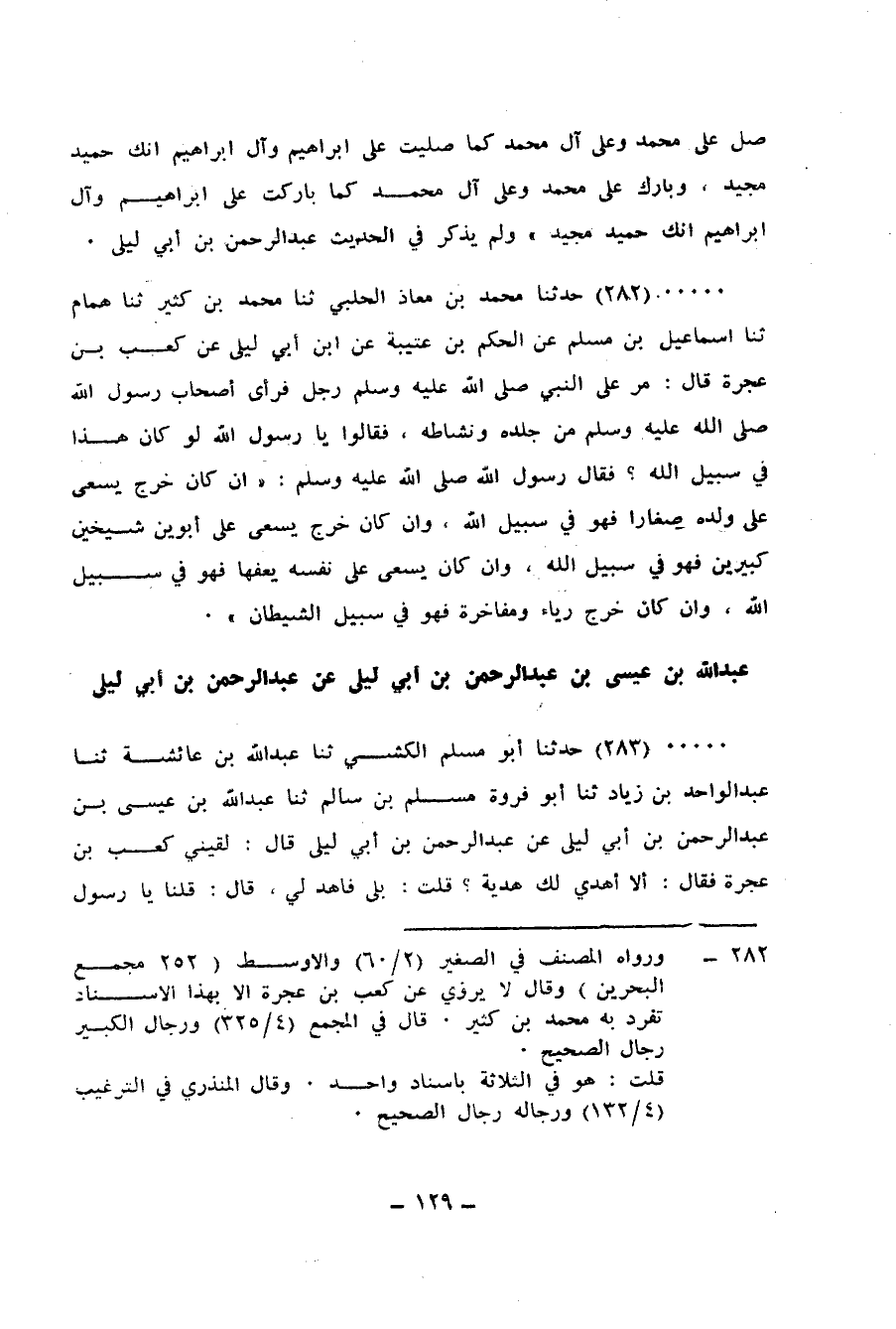 283 - حَدَّثَنَا أَبُو مُسْلِمٍ الْكَشِّيُّ، ثنا عَبْدُ اللهِ بْنُ عَائِشَةَ، ثنا عَبْدُ الْوَاحِدِ بْنُ زِيَادٍ، ثنا أَبُو فَرْوَةَ مُسْلِمُ بْنُ سَالِمٍ، ثنا عَبْدُ اللهِ بْنُ عِيسَى بْنِ عَبْدِ الرَّحْمَنِ بْنِ أَبِي لَيْلَى، عَنْ عَبْدِ الرَّحْمَنِ بْنِ أَبِي لَيْلَى، قَالَ: لَقِيَنِي كَعْبُ بْنُ عُجْرَةَ، فَقَالَ: أَلَا أُهْدِي لَكَ هَدِيَّةً؟ قُلْتُ: بَلَى، فَاهْدِهَا لِي، قَالَ: قُلْنَا: يَا رَسُولَ اللهِ كَيْفَ الصَّلَاةُ عَلَيْكُمْ أَهْلَ الْبَيْتِ، فَإِنَّ اللهَ عَزَّ وَجَلَّ قَدْ عَلَّمَنَا كَيْفَ نُسَلِّمُ؟، قَالَ: «§قُولُوا اللهُمَّ صَلِّ عَلَى مُحَمَّدٍ وَعَلَى آلِ مُحَمَّدٍ كَمَا صَلَّيْتَ عَلَى إِبْرَاهِيمَ إِنَّكَ حَمِيدٌ مَجِيدٌ، اللهُمَّ بَارِكْ عَلَى مُحَمَّدٍ وَآلِ مُحَمَّدٍ كَمَا بَارَكْتَ عَلَى إِبْرَاهِيمَ وَآلِ إِبْرَاهِيمَ إِنَّكَ حَمِيدٌ مَجِيدٌ»