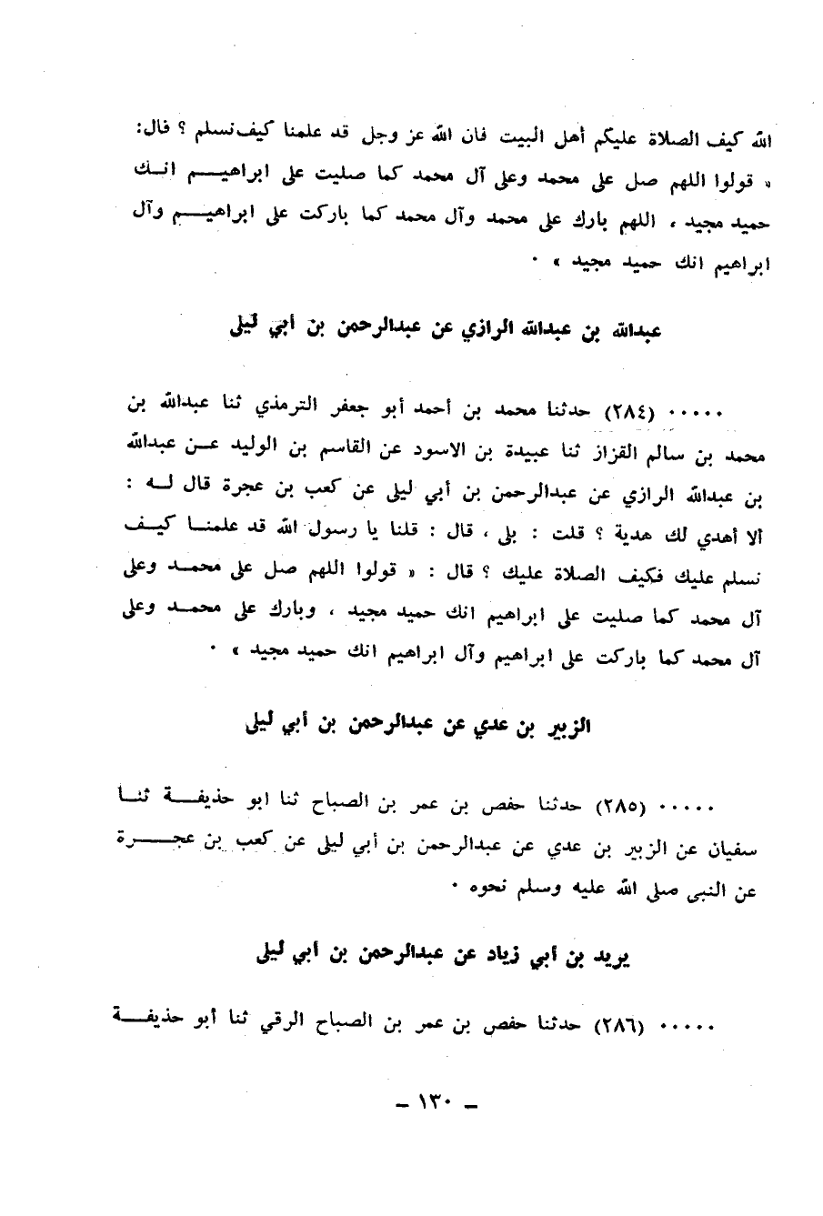 286 - حَدَّثَنَا حَفْصُ بْنُ عُمَرَ بْنِ الصَّبَّاحِ الرَّقِّيُّ، ثنا أَبُو حُذَيْفَةَ، ثنا سُفْيَانُ، عَنْ يَزِيدَ بْنِ أَبِي زِيَادٍ، عَنْ عَبْدِ الرَّحْمَنِ بْنِ أَبِي لَيْلَى، عَنْ كَعْبِ بْنِ عُجْرَة، قَالَ: لَمَّا نَزَلَتْ {إِنَّ اللهَ وَمَلَائِكَتَهُ يُصَلُّونَ عَلَى النَّبِيِّ} [الأحزاب: 56] ، الْحَدِيثُ -[131]-.