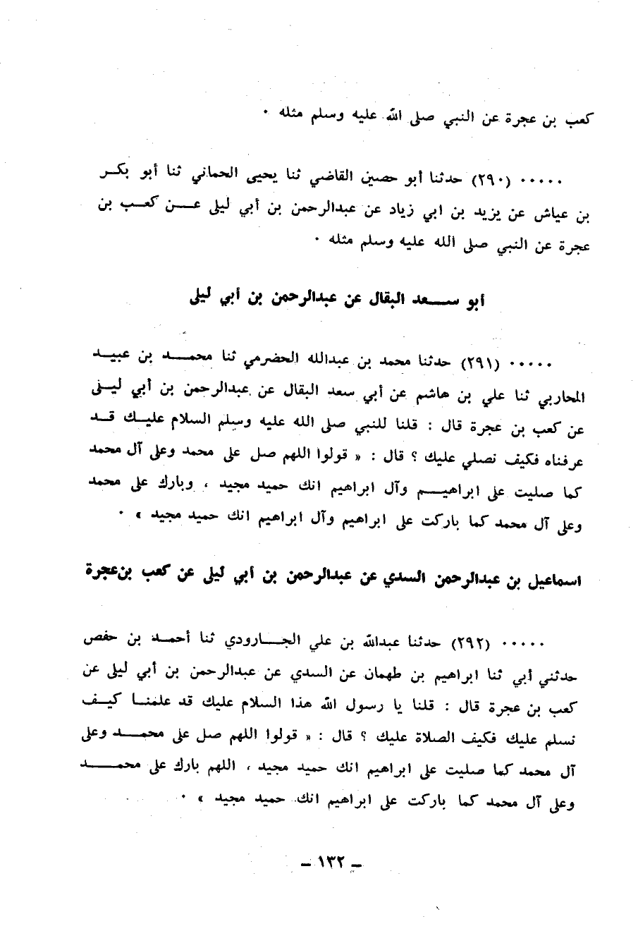291 - حَدَّثَنَا مُحَمَّدُ بْنُ عَبْدِ اللهِ الْحَضْرَمِيُّ، ثنا مُحَمَّدُ بْنُ عُبَيْدٍ الْمُحَارِبِيُّ، ثنا عَلِيُّ بْنُ هَاشِمٍ، عَنْ أبِي سَعْدٍ الْبَقَّالِ، عَنْ عَبْدِ الرَّحْمَنِ بْنِ أَبِي لَيْلَى، عَنْ كَعْبِ بْنِ عُجْرَة، قَالَ: قُلْنَا لِلنَّبِيِّ صَلَّى اللهُ عَلَيْهِ وَسَلَّمَ: السَّلَامُ عَلَيْكَ قَدْ عَرَفْنَاهُ، فَكَيْفَ نُصَلِّي عَلَيْكَ؟، قَالَ: " §قُولُوا: اللهُمَّ صَلِّ عَلَى مُحَمَّدٍ وَعَلَى آلِ مُحَمَّدٍ كَمَا صَلَّيْتَ عَلَى إِبْرَاهِيمَ وَآلِ إِبْرَاهِيمَ إِنَّكَ حَمِيدٌ مَجِيدٌ، وَبَارِكْ عَلَى مُحَمَّدٍ وَعَلَى آلِ مُحَمَّدٍ كَمَا بَارَكْتَ عَلَى إِبْرَاهِيمَ وَآلِ إِبْرَاهِيمَ إِنَّكَ حَمِيدٌ مَجِيدٌ "