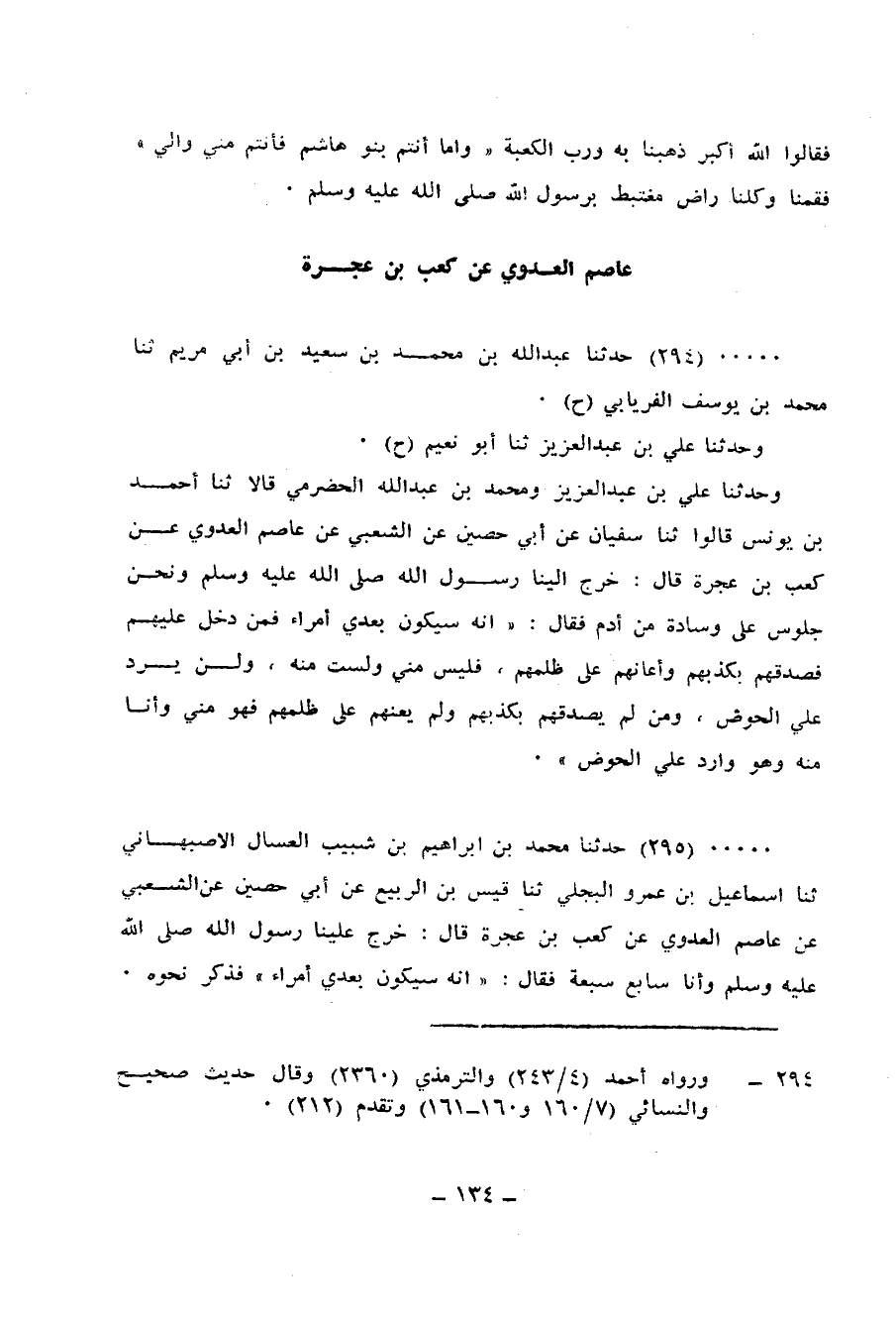 294 - حَدَّثَنَا عَبْدُ اللهِ بْنُ مُحَمَّدِ بْنِ سَعِيدِ بْنِ أَبِي مَرْيَمَ، ثنا مُحَمَّدُ بْنُ يُوسُفَ الْفِرْيَابِيُّ، ح وَحَدَّثَنَا عَلِيُّ بْنُ عَبْدِ الْعَزِيزِ، ثنا أَبُو نُعَيْمٍ، ح وَحَدَّثَنَا عَلِيُّ بْنُ عَبْدِ الْعَزِيزِ، وَمُحَمَّدُ بْنُ عَبْدِ اللهِ الْحَضْرَمِيُّ، قَالَا: ثنا أَحْمَدُ بْنُ يُونُسَ، قَالُوا: ثنا سُفْيَانُ، عَنْ أبِي حُصَيْنٍ، عَنِ الشَّعْبِيِّ، عَنْ عَاصِمٍ الْعَدَوِيِّ، عَنْ كَعْبِ بْنِ عُجْرَة، قَالَ: خَرَجَ إِلَيْنَا رَسُولُ اللهِ صَلَّى اللهُ عَلَيْهِ وَسَلَّمَ وَنَحْنُ جُلُوسٌ عَلَى وِسَادَةٍ مِنْ آدَمٍ، فَقَالَ: «إِنَّهُ» §سَيَكُونُ بَعْدِي أُمَرَاءُ، فَمَنْ دَخَلَ عَلَيْهِمْ فَصَدَّقَهُمْ بِكَذِبِهِمْ وَأَعَانَهُمْ عَلَى ظُلْمِهِمْ فَلَيْسَ مِنِّي وَلَسْتُ مِنْهُ وَلَنْ يَرِدَ عَلَى الْحَوْضِ، وَمَنْ لَمْ يُصَدِّقْهُمْ بِكَذِبِهِمْ وَلَمْ يُعِنْهُمْ عَلَى ظُلْمِهِمْ فَهُوَ مِنِّي وَأَنَا مِنْهُ وَهُوَ وَارِدٌ عَلَى الْحَوْضِ ".