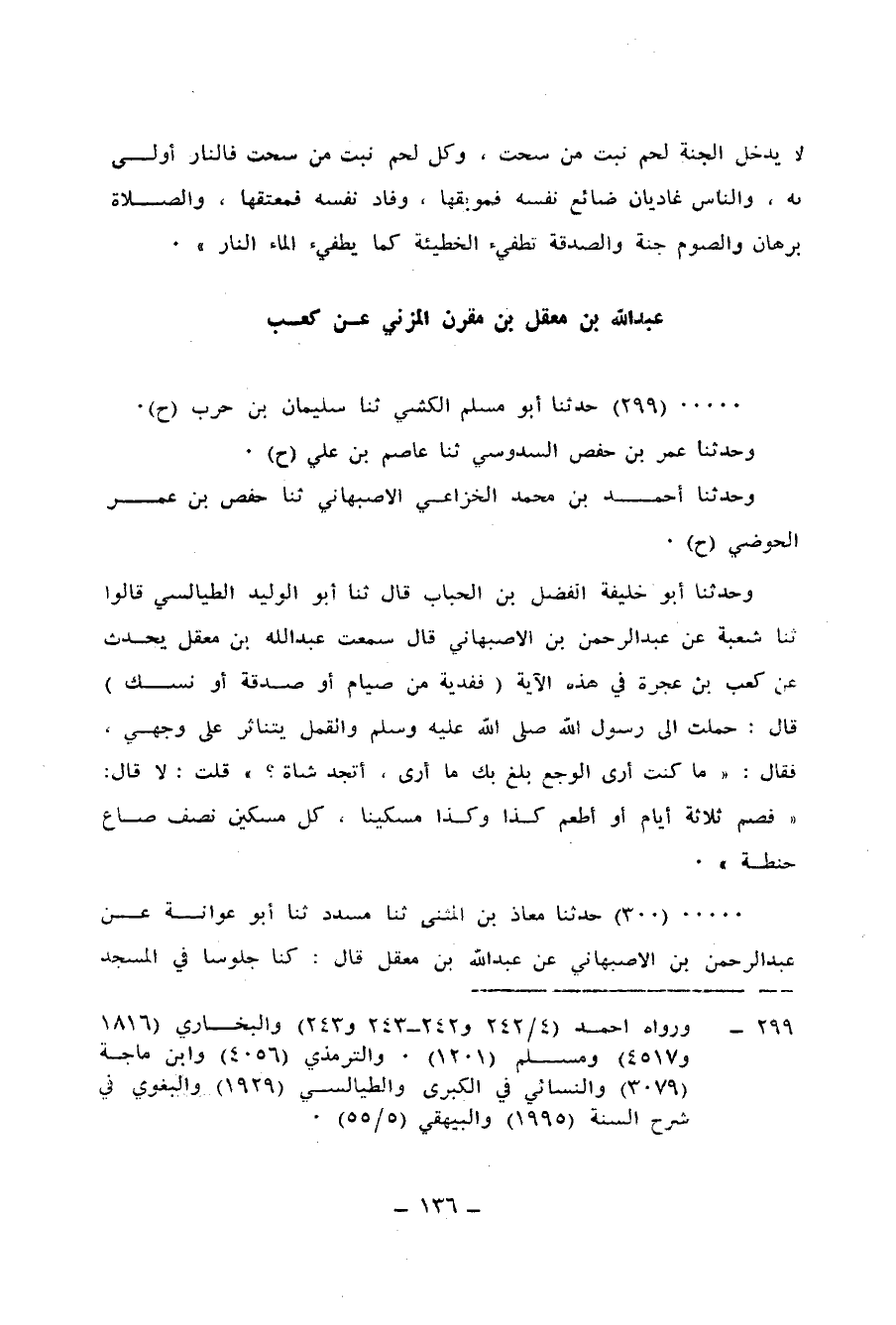 299 - حَدَّثَنَا أَبُو مُسْلِمٍ الْكَشِّيُّ، ثنا سُلَيْمَانُ بْنُ حَرْبٍ، ح وَحَدَّثَنَا عُمَرُ بْنُ حَفْصٍ السَّدُوسِيُّ، ثنا عَاصِمُ بْنُ عَلِيٍّ، ح وَحَدَّثَنَا أَحْمَدُ بْنُ مُحَمَّدٍ الْخُزَاعِيُّ الْأَصْبَهَانِيُّ، ثنا حَفْصُ بْنُ عُمَرَ الْحَوْضِيُّ، ح وَحَدَّثَنَا أَبُو خَلِيفَةَ الْفَضْلُ بْنُ الْحُبَابَ، قَالَ: ثنا أَبُو الْوَلِيدِ الطَّيَالِسِيُّ، قَالُوا: ثنا شُعْبَةُ، عَنْ عَبْدِ الرَّحْمَنِ بْنِ الْأَصْبَهَانِيِّ، قَالَ: سَمِعْتُ عَبْدَ اللهِ بْنَ مَعْقِلٍ، يُحَدِّثُ عَنْ كَعْبِ بْنِ عُجْرَة، فِي هَذِهِ الْآيَةِ {فَفِدْيَةٌ مِنْ صِيَامٍ أَوْ صَدَقَةٍ أَوْ نُسُكٍ} [البقرة: 196] ، قَالَ: حُمِلْتُ إِلَى رَسُولِ اللهِ صَلَّى اللهُ عَلَيْهِ وَسَلَّمَ وَالْقَمْلُ يَتَنَاثَرُ عَلَى وَجْهِي، فَقَالَ: «§مَا كُنْتُ أَرَى الْوَجَعَ بَلَغَ بِكَ مَا أَرَى، أَتَجِدُ شَاةً؟» ، قُلْتُ: لَا، قَالَ: «فَصُمْ ثَلَاثَةَ أَيَّامٍ أَوْ أَطْعِمْ كَذَا وَكَذَا مِسْكِينًا، كُلُّ مِسْكِينٍ نِصْفُ صَاعٍ حِنْطَةً»