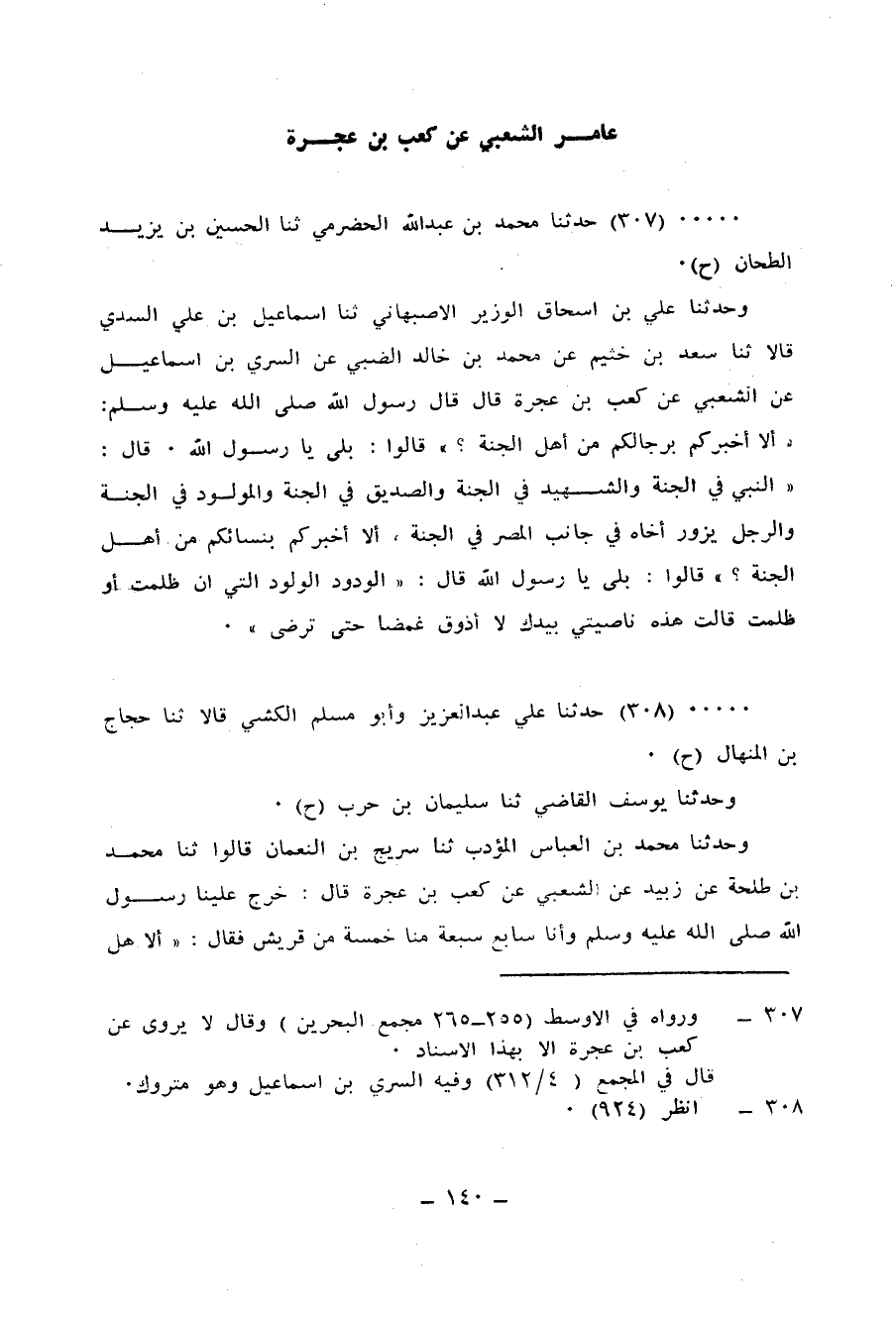 307 - حَدَّثَنَا مُحَمَّدُ بْنُ عَبْدِ اللهِ الْحَضْرَمِيُّ، ثنا الْحُسَيْنُ بْنُ يَزِيدَ الطَّحَّانُ، ح وَحَدَّثَنَا عَلِيُّ بْنُ إِسْحَاقَ الْوَزِيرُ الْأَصْبَهَانِيُّ، ثنا إِسْمَاعِيلُ بْنُ عَلِيٍّ السُّدِّيُّ، قَالَا: ثنا سَعِيدُ بْنُ خُثَيْمٍ، عَنْ مُحَمَّدِ بْنِ خَالِدٍ الضَّبِّيِّ، عَنِ السَّرِيِّ بْنِ إِسْمَاعِيلَ، عَنِ الشَّعْبِيِّ، عَنْ كَعْبِ بْنِ عُجْرَة، قَالَ: قَالَ رَسُولُ اللهِ صَلَّى اللهُ عَلَيْهِ وَسَلَّمَ: «§أَلَا أُخْبِرُكُمْ بِرِجَالِكُمْ مِنْ أَهْلِ الْجَنَّةِ؟» ، قَالُوا: بَلَى يَا رَسُولَ اللهِ، قَالَ: «النَّبِيُّ فِي الْجَنَّةِ، وَالشَّهِيدُ فِي الْجَنَّةِ، وَالصِّدِّيقُ فِي الْجَنَّةِ، وَالْمَوْلُودُ فِي الْجَنَّةِ، وَالرَّجُلُ يَزُورُ أَخَاهُ فِي جَانِبِ الْمِصْرِ فِي الْجَنَّةِ، أَلَا أُخْبِرُكُمْ بِنِسَائِكُمْ مِنْ أَهْلِ الْجَنَّةِ؟» ، قَالُوا: بَلَى يَا رَسُولَ اللهِ، قَالَ: " الْوَدُودُ الْوَلُودُ الَّتِي إِنْ ظَلَمَتْ أَوْ ظُلِمَتْ قَالَتْ: هَذِهِ نَاصِيَتِي بِيَدِكَ، لَا أَذُوقُ غَمْضًا حَتَّى تَرْضَى "