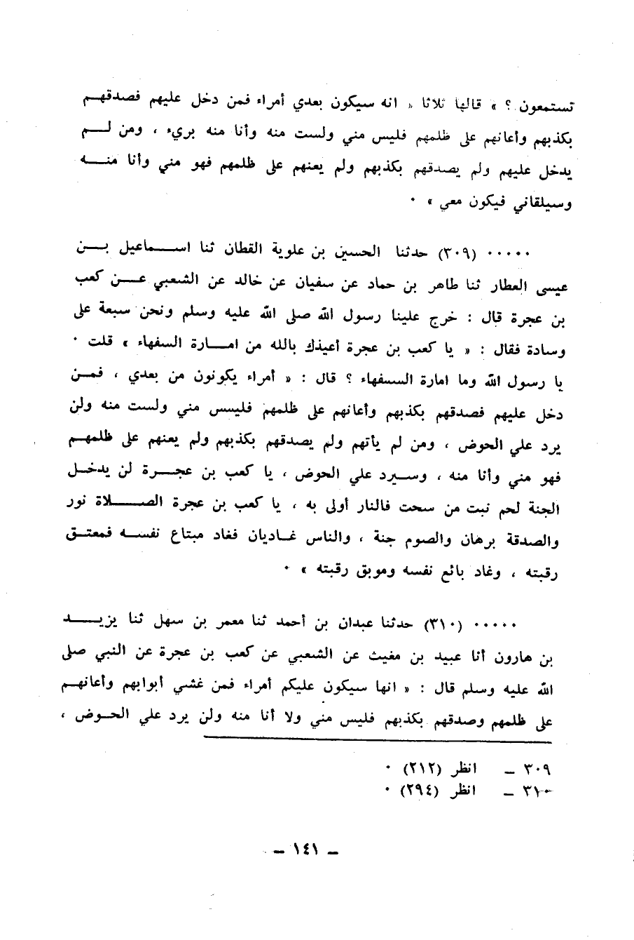 309 - حَدَّثَنَا الْحُسَيْنُ بْنُ عَلَوَيْهِ الْقَطَّانُ، ثنا إِسْمَاعِيلُ بْنُ عِيسَى الْعَطَّارُ، ثنا طَاهِرُ بْنُ حَمَّادٍ، عَنْ سُفْيَانَ، عَنْ خَالِدٍ، عَنِ الشَّعْبِيِّ، عَنْ كَعْبِ بْنِ عُجْرَة، قَالَ: خَرَجَ عَلَيْنَا رَسُولُ اللهِ صَلَّى اللهُ عَلَيْهِ وَسَلَّمَ وَنَحْنُ سَبْعَةٌ عَلَى وِسَادَةٍ، فَقَالَ: «يَا كَعْبُ بْنَ عُجْرَةَ أُعِيذُكَ بِاللهِ مِنْ إِمَارَةِ السُّفَهَاءِ» ، قُلْتُ: يَا رَسُولَ اللهِ §وَمَا إِمَارَةُ السُّفَهَاءِ؟، قَالَ: «أُمَرَاءُ يَكُونُونَ مِنْ بَعْدِي، فَمَنْ دَخَلَ عَلَيْهِمْ فَصَدَّقَهُمْ بِكَذِبِهِمْ وَأَعَانَهُمْ عَلَى ظُلْمِهِمْ فَلَيْسَ مِنِّي وَلَسْتُ مِنْهُ وَلَنْ يَرِدَ عَلَى الْحَوْضِ، وَمَنْ لَمْ يَأْتِهِمْ وَلَمْ يُصَدِّقْهُمْ بِكَذِبِهِمْ وَلَمْ يُعِنْهُمْ عَلَى ظُلْمِهِمْ فَهُوَ مِنِّي وَأَنَا مِنْهُ وَسَيَرِدُ عَلَى الْحَوْضِ»