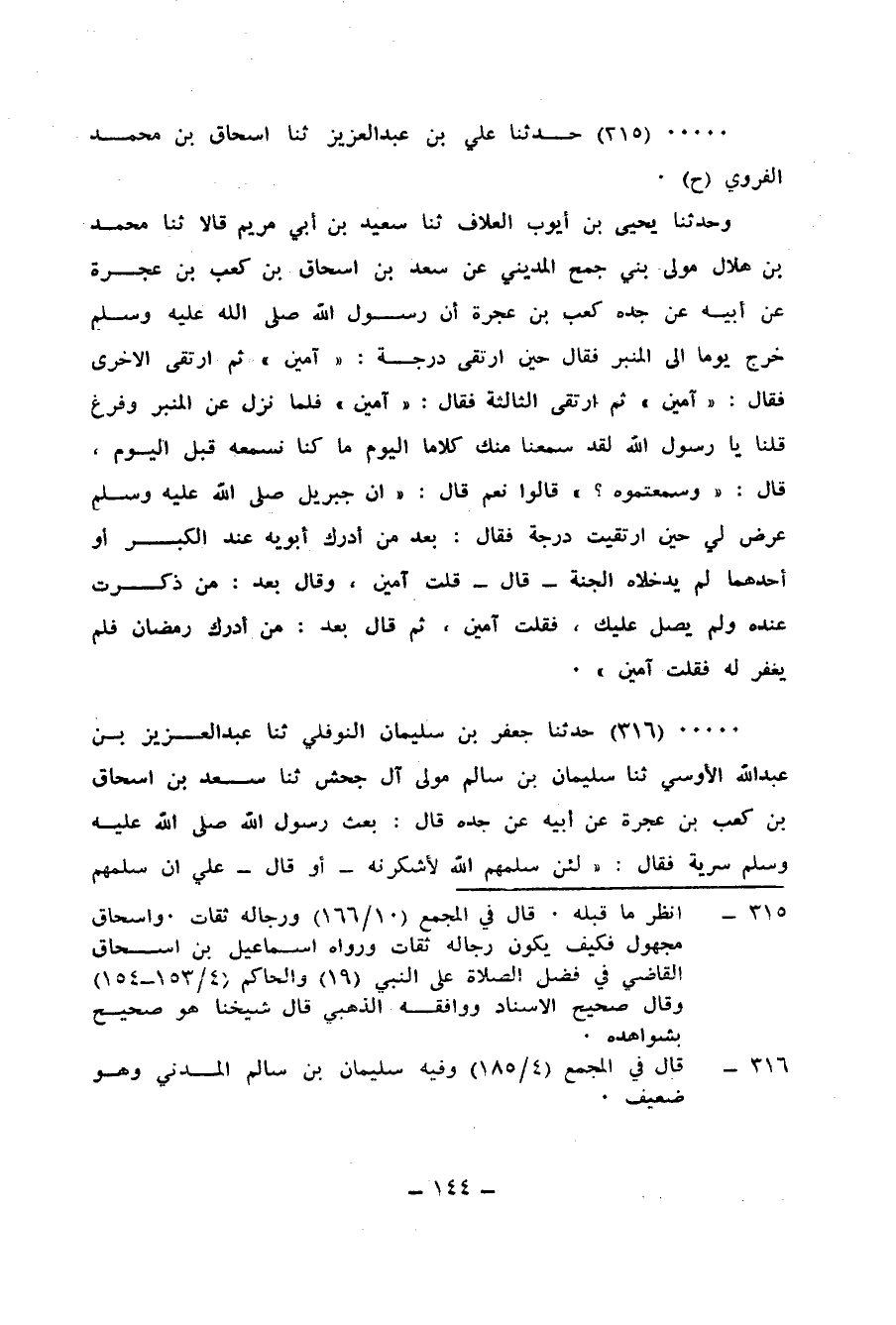 315 - حَدَّثَنَا عَلِيُّ بْنُ عَبْدِ الْعَزِيزِ، ثنا إِسْحَاقُ بْنُ مُحَمَّدٍ الْفَرْوِيُّ، ح وَحَدَّثَنَا يَحْيَى بْنُ أَيُّوبَ الْعَلَّافُ، ثنا سَعِيدُ بْنُ أَبِي مَرْيَمَ، قَالَا: ثنا مُحَمَّدُ بْنُ هِلَالٍ، مَوْلَى بَنِي جُمَحَ الْمَدِينِيُّ، عَنْ سَعْدِ بْنِ إِسْحَاقَ بْنِ كَعْبِ بْنِ عُجْرَةَ، عَنْ أبِيهِ، عَنْ جَدِّهِ كَعْبِ بْنِ عُجْرَةَ، أَنَّ رَسُولَ اللهِ صَلَّى اللهُ عَلَيْهِ وَسَلَّمَ خَرَجَ يَوْمًا إِلَى الْمِنْبَرِ فَقَالَ حِينَ " §ارْتَقَى دَرَجَةً: «آمِينَ» ، ثُمَّ ارْتَقَى الْأُخْرَى فَقَالَ: «آمِينَ» ، ثُمَّ ارْتَقَى الثَّالِثَةَ فَقَالَ: «آمِينَ» ، فَلَمَّا نَزَلَ عَنِ الْمِنْبَرِ وَفَرَغَ، قُلْنَا: يَا رَسُولَ اللهِ لَقَدْ سَمِعْنَا مِنْكَ كَلَامًا الْيَوْمَ مَا كُنَّا نَسْمَعُهُ قَبْلَ الْيَوْمِ؟، قَالَ: «وَسَمِعْتُمُوهُ؟» ، قَالُوا: نَعَمْ، قَالَ: " إِنَّ جِبْرِيلَ صَلَّى اللهُ عَلَيْهِ وَسَلَّمَ عَرَضَ لِي حِينَ ارْتَقَيْتُ دَرَجَةً فَقَالَ: بَعُدَ مَنْ أَدْرَكَ أَبَوَيْهِ عِنْدَ الْكِبْرِ أَوْ أَحَدَهُمَا لَمْ يُدْخِلَاهُ الْجَنَّةَ، قَالَ: قُلْتُ: آمِينَ، وَقَالَ: بَعُدَ مَنْ ذُكِرْتُ عِنْدَهُ وَلَمْ يُصَلِّ عَلَيْكَ، فَقُلْتُ: آمِينَ، ثُمَّ قَالَ: بَعُدَ مَنْ أَدْرَكَ رَمَضَانَ فَلَمْ يُغْفَرْ لَهُ، فَقُلْتُ: آمِينَ "