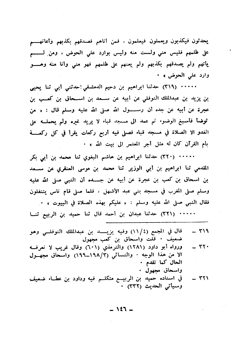319 - حَدَّثَنَا إِبْرَاهِيمُ بْنُ دُحَيْمٍ الدِّمَشْقِيُّ، حَدَّثَنِي أَبِي، ثنا يَحْيَى بْنُ يَزِيدَ بْنِ عَبْدِ الْمَلِكِ النَّوْفَلِيُّ، عَنْ أبِيهِ، عَنْ سَعْدِ بْنِ إِسْحَاقَ بْنِ كَعْبِ بْنِ عُجْرَةَ، عَنْ أبِيهِ، عَنْ جَدِّهِ، أَنَّ رَسُولَ اللهِ صَلَّى اللهُ عَلَيْهِ وَسَلَّمَ قَالَ: «§مَنْ تَوَضَّأَ فَأَسْبَغَ الْوُضُوءَ ثُمَّ عَمَدَ إِلَى مَسْجِدِ قُبَاءٍ لَا يُرِيدُ غَيْرَهُ وَلَمْ يَحْمِلْهُ عَلَى الْغُدُوِّ إِلَّا الصَّلَاةُ فِي مَسْجِدِ قُبَاءٍ فَصَلَّى فِيهِ أَرْبَعَ رَكَعَاتٍ يَقْرَأُ فِي كُلِّ رَكْعَةٍ بِأُمِّ الْقُرْآنِ، كَانَ لَهُ مِثْلُ أَجْرِ الْمُعْتَمِرِ إِلَى بَيْتِ اللهِ»