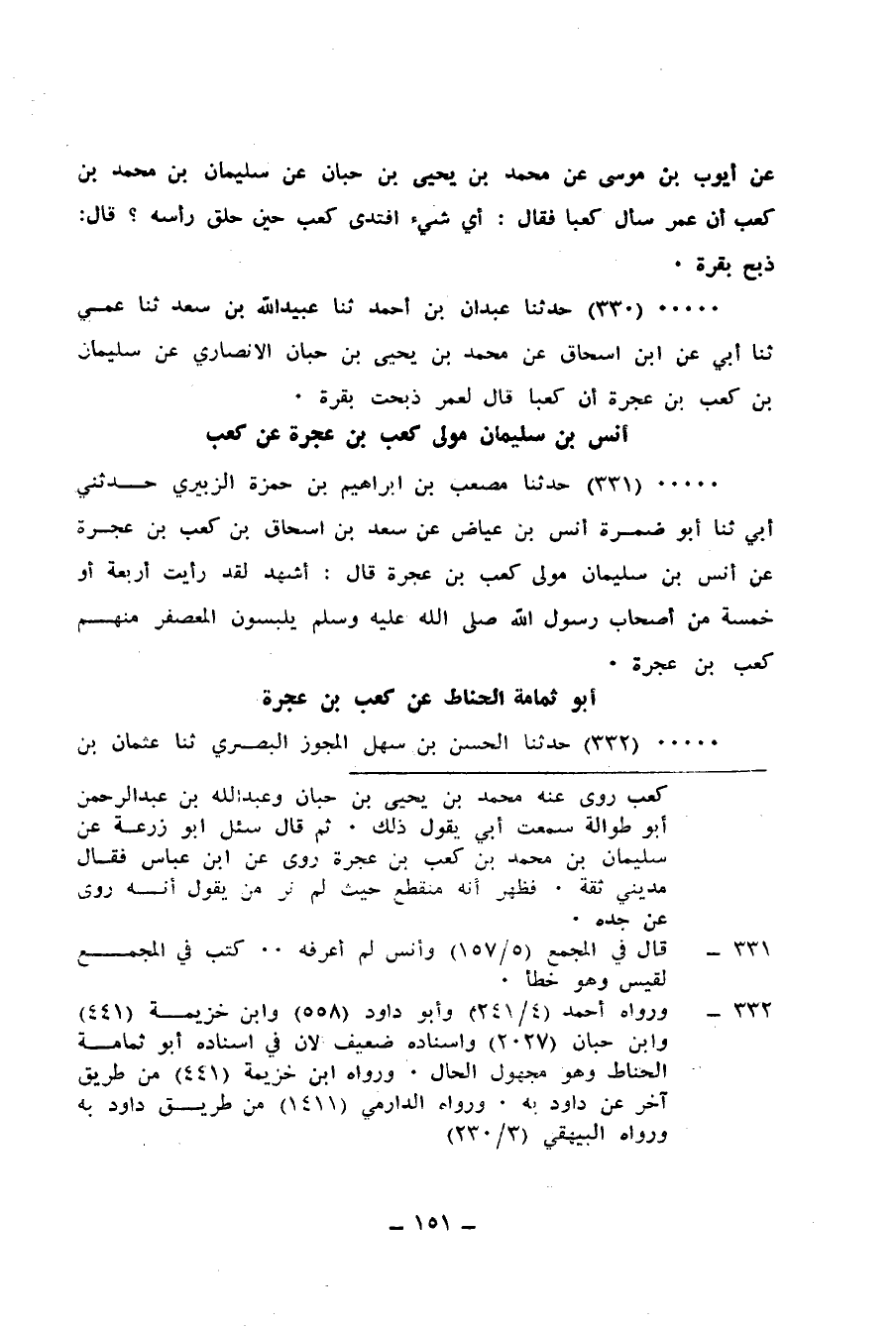 330 - حَدَّثَنَا عَبْدَانُ بْنُ أَحْمَدَ، ثنا عُبَيْدُ اللهِ بْنُ سَعْدٍ، ثنا عَمِّي، ثنا أَبِي، عَنِ ابْنِ إِسْحَاقَ، عَنْ مُحَمَّدِ بْنِ يَحْيَى بْنِ حَبَّانَ الْأَنْصَارِيُّ، عَنْ سُلَيْمَانَ بْنِ كَعْبِ بْنِ عُجْرَةَ، أَنَّ كَعْبًا، قَالَ لِعُمَرَ: «§ذَبَحْتُ بَقَرَةً»
