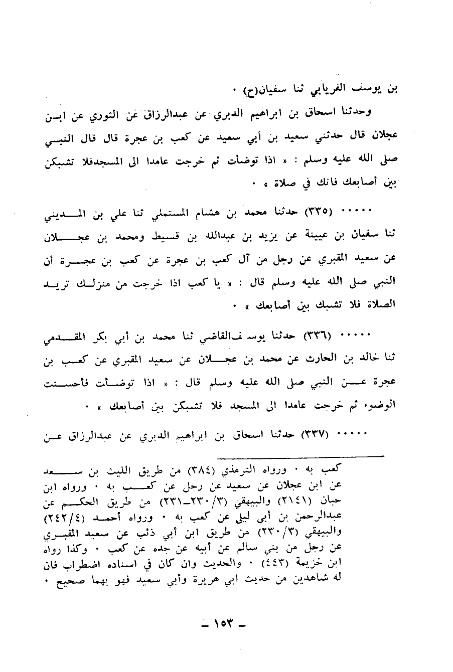 335 - حَدَّثَنَا مُحَمَّدُ بْنُ هِشَامٍ الْمُسْتَمْلِي، ثنا عَلِيُّ بْنُ الْمَدِينِيِّ، ثنا سُفْيَانُ بْنُ عُيَيْنَةَ، عَنْ يَزِيدَ بْنِ عَبْدِ اللهِ بْنِ قُسَيْطٍ، وَمُحَمَّدِ بْنِ عَجْلَانَ، عَنْ سَعِيدٍ الْمَقْبُرِيِّ، عَنْ رَجُلٍ مِنْ آلِ كَعْبِ بْنِ عُجْرَةَ، عَنْ كَعْبِ بْنِ عُجْرَة، أَنَّ النَّبِيَّ صَلَّى اللهُ عَلَيْهِ وَسَلَّمَ قَالَ: «يَا كَعْبُ» §إِذَا خَرَجْتَ مِنْ مَنْزِلِكَ تُرِيدُ الصَّلَاةَ فَلَا تُشَبِّكْ بَيْنَ أَصَابِعِكَ "
