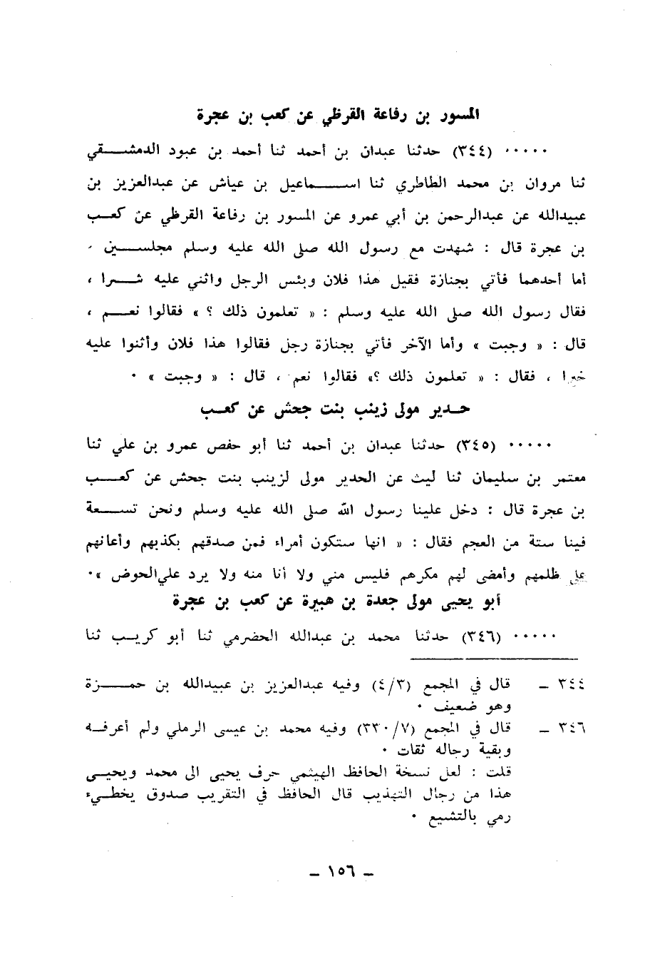 344 - حَدَّثَنَا عَبْدَانُ بْنُ أَحْمَدَ، ثنا أَحْمَدُ بْنُ عَبُّودٍ الدِّمَشْقِيُّ، ثنا مَرْوَانُ بْنُ مُحَمَّدٍ الطَّاطَرِيُّ، ثنا إِسْمَاعِيلُ بْنُ عَيَّاشٍ، عَنْ عَبْدِ الْعَزِيزِ بْنِ عُبَيْدِ اللهِ، عَنْ عَبْدِ الرَّحْمَنِ بْنِ أَبِي عَمْرٍو، عَنِ الْمِسْوَرِ بْنِ رِفَاعَةَ الْقُرَظِيِّ، عَنْ كَعْبِ بْنِ عُجْرَة، قَالَ: §شَهِدْتُ مَعَ رَسُولِ اللهِ صَلَّى اللهُ عَلَيْهِ وَسَلَّمَ مَجْلِسَيْنِ: أَمَا أَحَدُهُمَا فَأُتِيَ بِجِنَازَةٍ فَقِيلَ: هَذَا فُلَانٌ، وَبِئْسَ الرَّجُلُ، وَأُثْنِيَ عَلَيْهِ شَرًّا، فَقَالَ رَسُولُ اللهِ صَلَّى اللهُ عَلَيْهِ وَسَلَّمَ: «تَعْلَمُونَ ذَلِكَ؟» ، فَقَالُوا: نَعَمْ، قَالَ: «وَجَبَتْ» ، وَأَمَّا الْآخَرُ فَأُتِيَ بِجِنَازَةِ رَجُلٍ فَقَالُوا: هَذَا فُلَانٌ، وَأَثْنَوْا عَلَيْهِ خَيْرًا، فَقَالَ: «تَعْلَمُونَ ذَلِكَ؟» ، فَقَالُوا: نَعَمْ، قَالَ: «وَجَبَتْ»