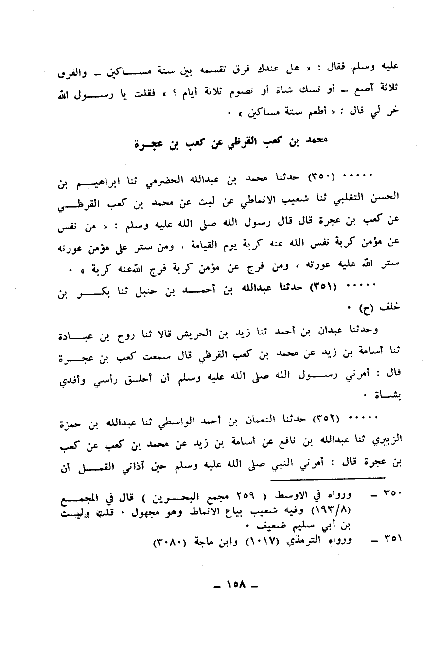351 - حَدَّثَنَا عَبْدُ اللهِ بْنُ أَحْمَدَ بْنِ حَنْبَلٍ، ثنا بَكْرُ بْنُ خَلَفٍ، ح وَحَدَّثَنَا عَبْدَانُ بْنُ أَحْمَدَ، ثنا زَيْدُ بْنُ الْحَرِيشِ، قَالَا: ثنا رَوْحُ بْنُ عُبَادَةَ، ثنا أُسَامَةُ بْنُ زَيْدٍ، عَنْ مُحَمَّدِ بْنِ كَعْبٍ الْقُرَظِيُّ، قَالَ: سَمِعْتُ كَعْبَ بْنَ عُجْرَةَ، قَالَ: «§أَمَرَنِي رَسُولُ اللهِ صَلَّى اللهُ عَلَيْهِ وَسَلَّمَ أَنْ أَحْلِقَ رَأْسِي وَأَفْدِيَ بِشَاةٍ»