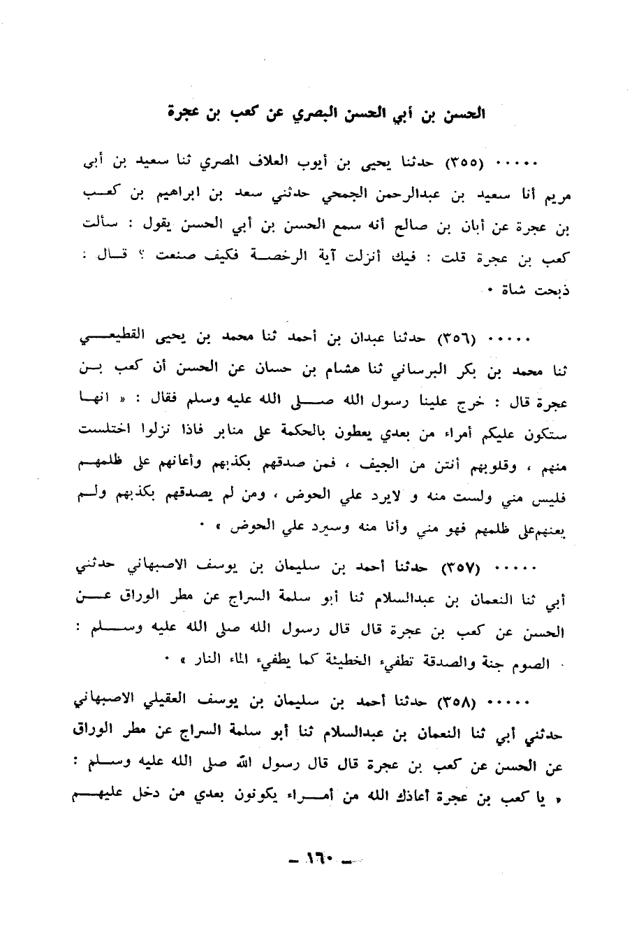 358 - حَدَّثَنَا أَحْمَدُ بْنُ سُلَيْمَانَ بْنِ يُوسُفَ الْعُقَيْلِيُّ الْأَصْبَهَانِيُّ، حَدَّثَنِي أَبِي، ثنا النُّعْمَانُ بْنُ عَبْدِ السَّلَامِ، ثنا أَبُو سَلَمَةَ السِّرَاجُ، عَنْ مَطَرٍ الْوَرَّاقِ، عَنِ الْحَسَنِ، عَنْ كَعْبِ بْنِ عُجْرَة، قَالَ: قَالَ رَسُولُ اللهِ صَلَّى اللهُ عَلَيْهِ وَسَلَّمَ: «يَا كَعْبُ بْنَ عُجْرَةَ §أَعَاذَكَ اللهُ مِنْ أُمَرَاءَ يَكُونُونَ بَعْدِي، مَنْ دَخَلَ عَلَيْهِمْ فَصَدَّقَهُمْ بِكَذِبِهِمْ وَأَعَانَهُمْ عَلَى ظُلْمِهِمْ فَلَيْسَ مِنِّي وَلَسْتُ مِنْهُ وَلَنْ يَرِدُ عَلَى الْحَوْضِ»